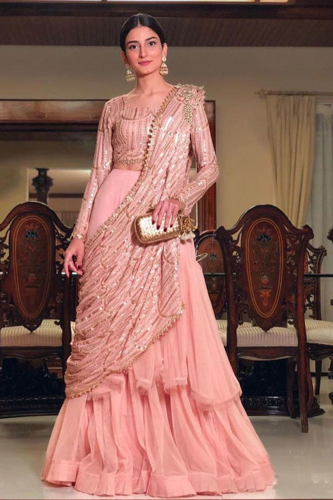 Statement net tiered lengha with pleats and pulled out thread detailing paired with a beautiful self embroidered and sequins worked choli with gold gota accents. The dupatta matches the choli and can be styled as shown in the picture. Lengha 44 inches Choli 14 inches Front neckline 7.5 inches Back neckline 10 inches 4 inches heels