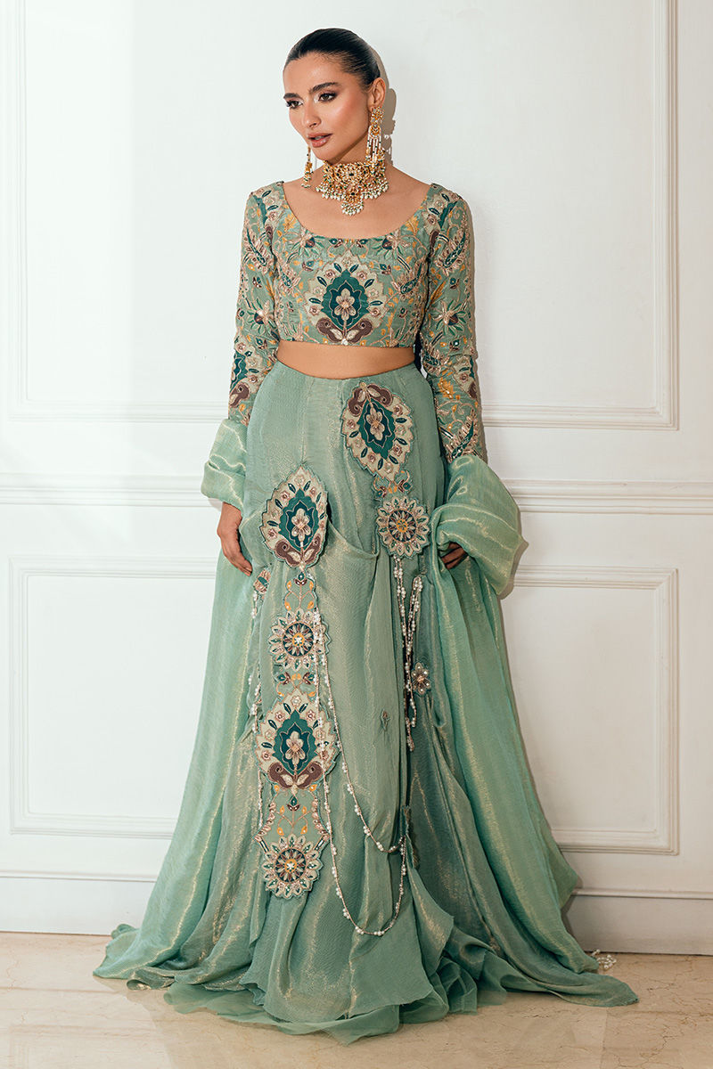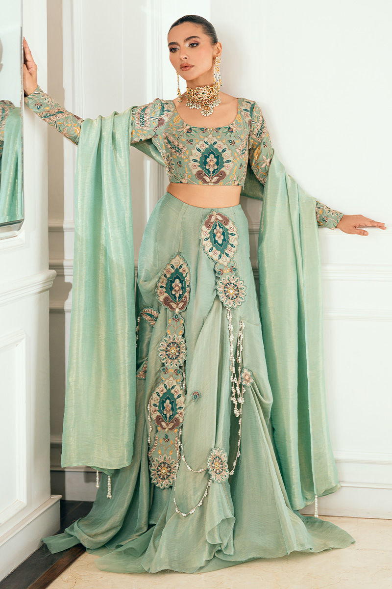 Amelia is a refreshing mint green georgette chiffon choli adorned with intricate handwork featuring zardozi and thread embroidery. It is paired with a masoori fabric lehnga detailed with 3D handwork zardozi brooches and handmade pearl and thread strings for a luxurious finish. The ensemble is completed with a masoori fabric dupatta, enhancing the graceful silhouette.