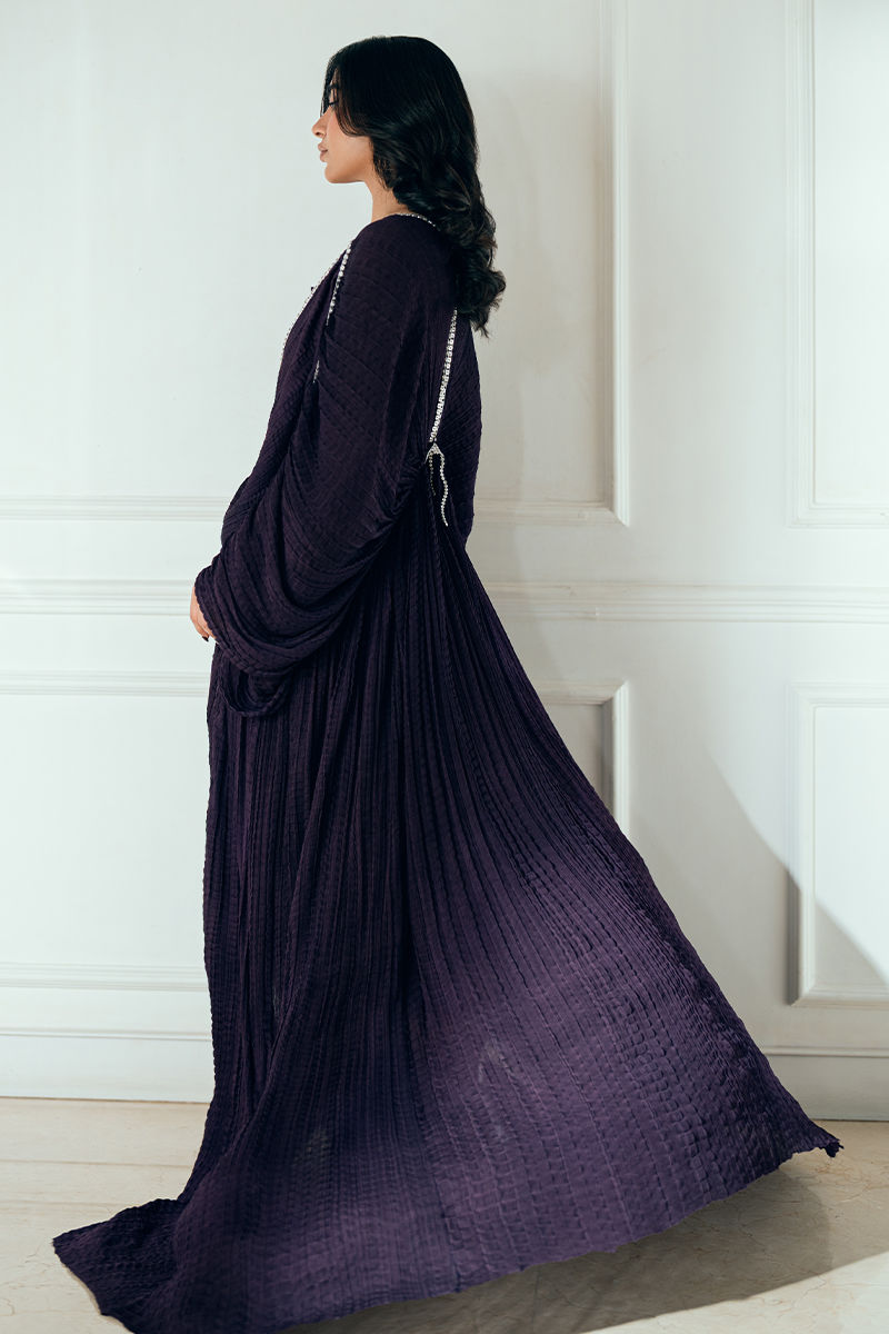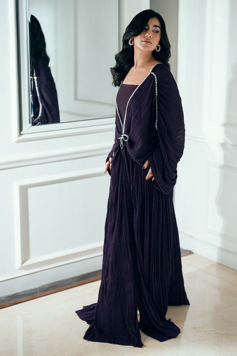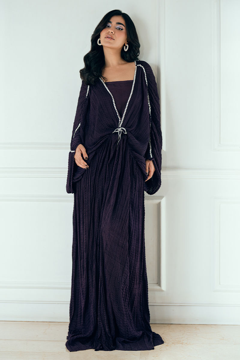 Amy georgette chiffon kaftan showcases diamond-worked necklines on the front, back, and sleeves, paired with elegant 3D bow brooch details on both front and back.