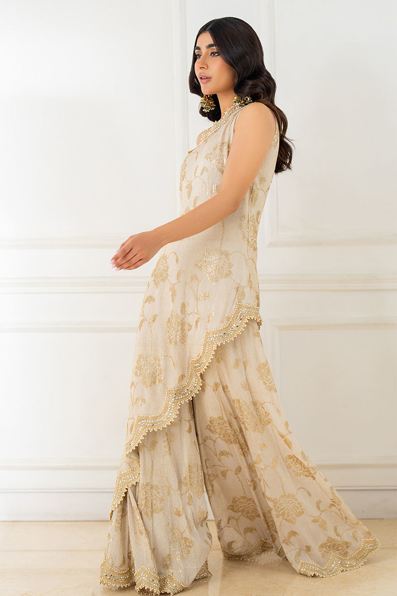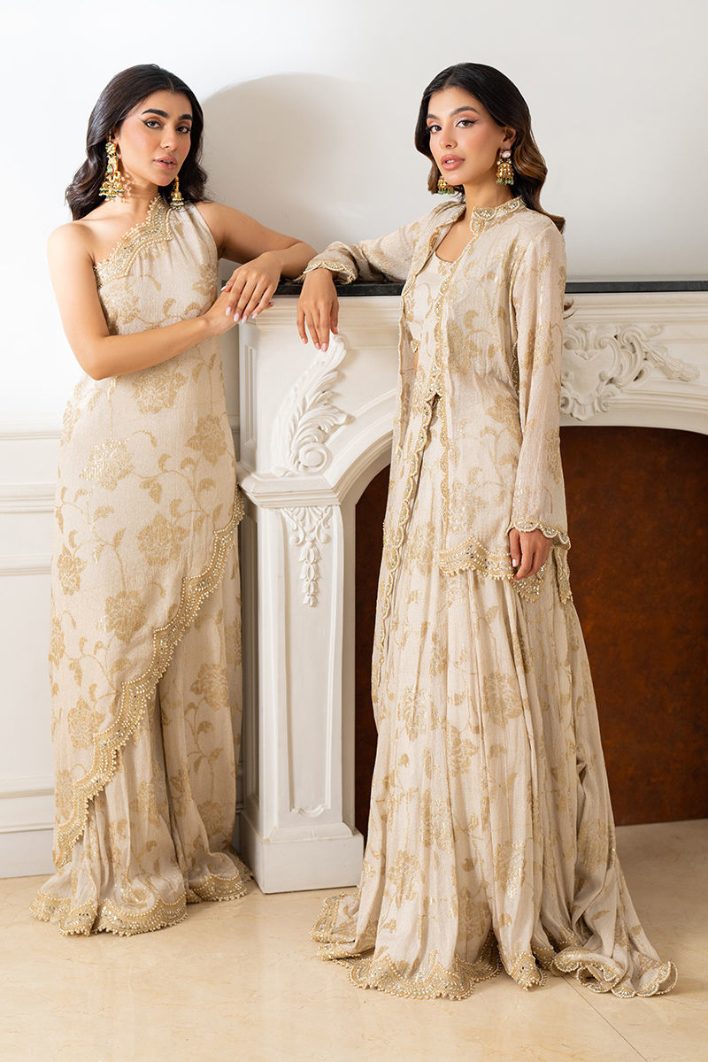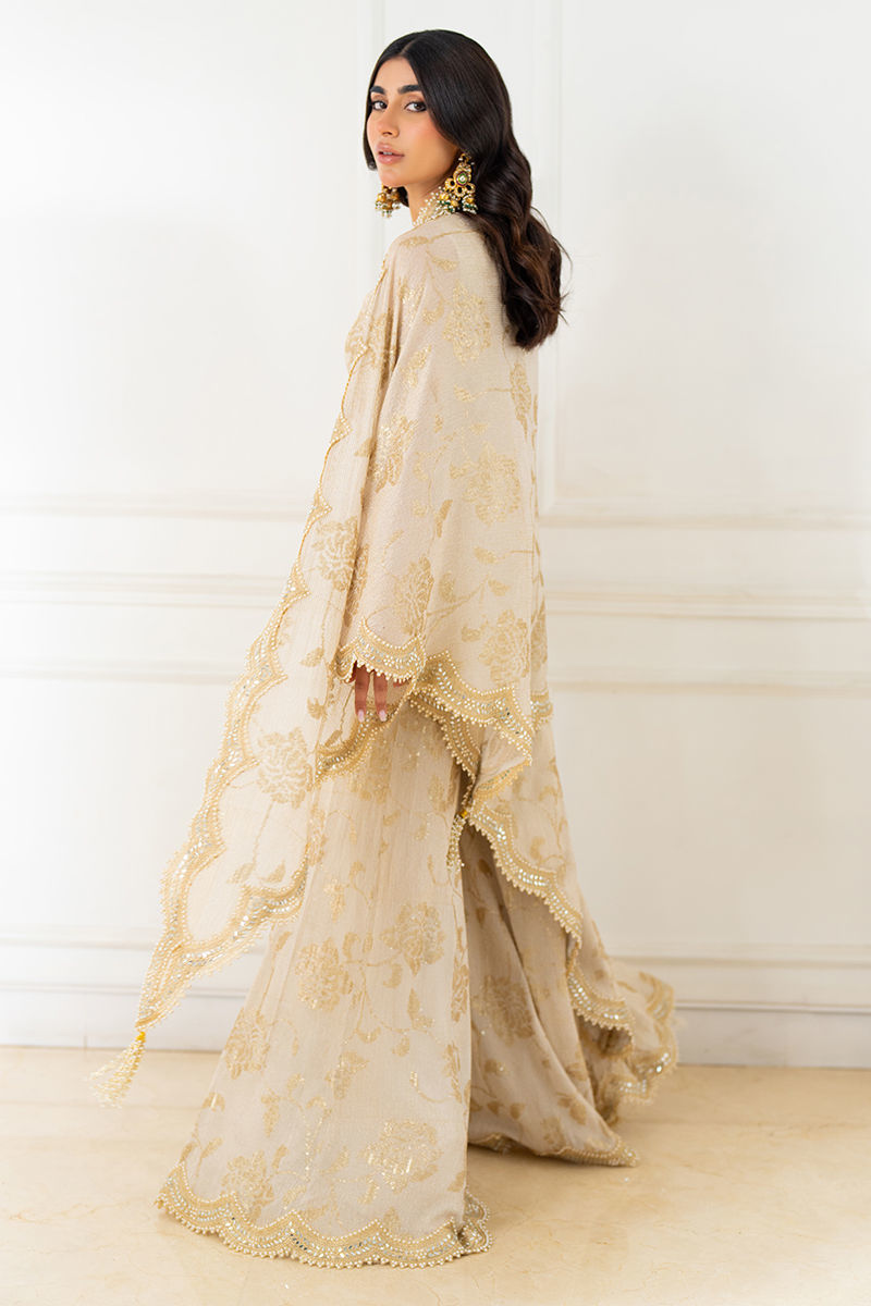 Embrace the opulence of gold floral sequin work with this off-shoulder ensemble, featuring a draped dupatta with pearl and zari scalloped borders and paired with elegant Dhaka pants. A perfect blend of tradition and glamour.