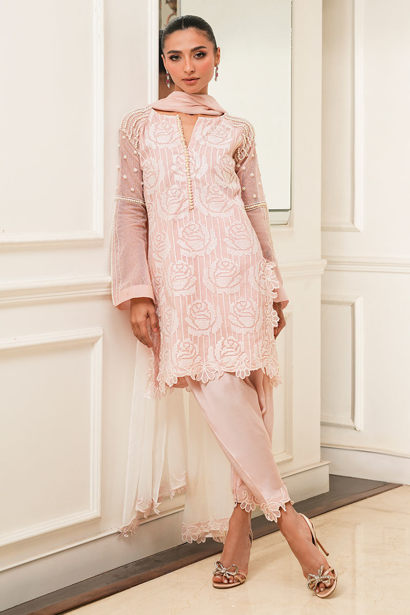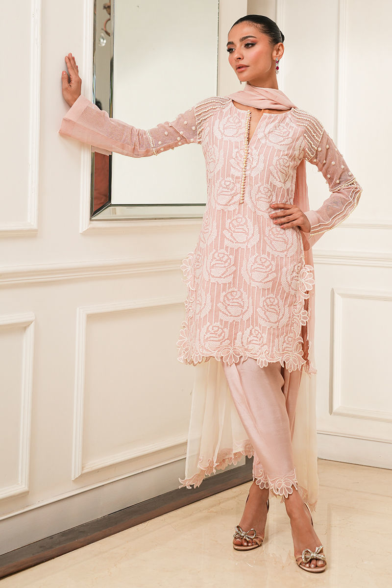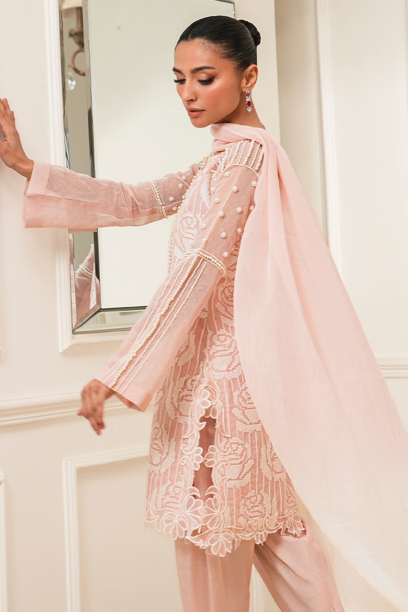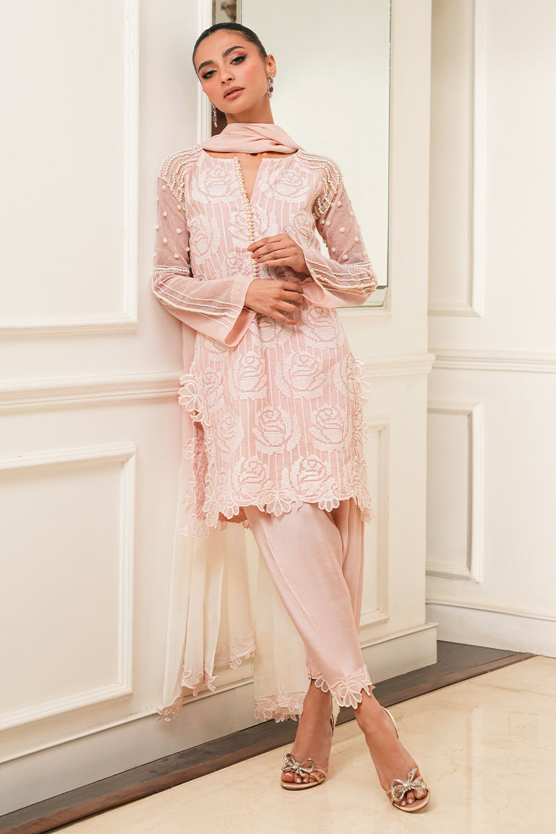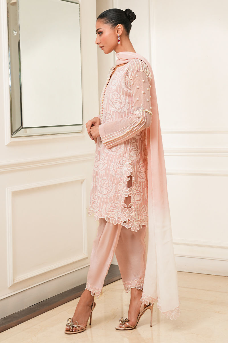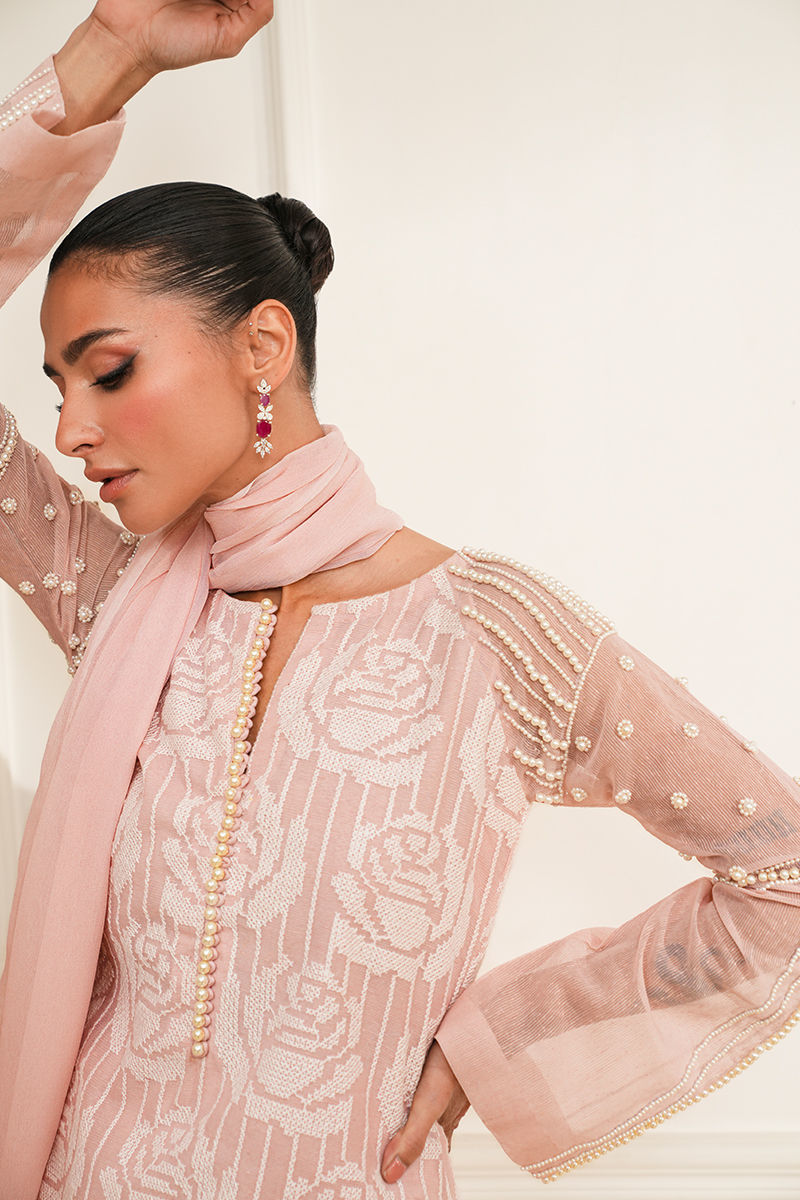 Kora cotton shirt adorned with pink cross-stitch detailing across the shirt and sleeves, highlighted with handcrafted pearl work. Cutwork borders accent the slits and daman, finished with pearl loop buttons along the neckline. Paired with a chiffon dupatta and silk shalwar featuring cutwork borders.