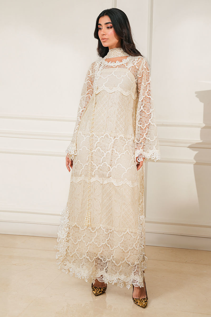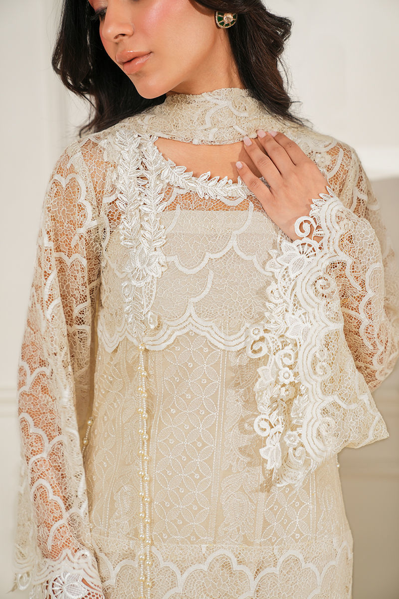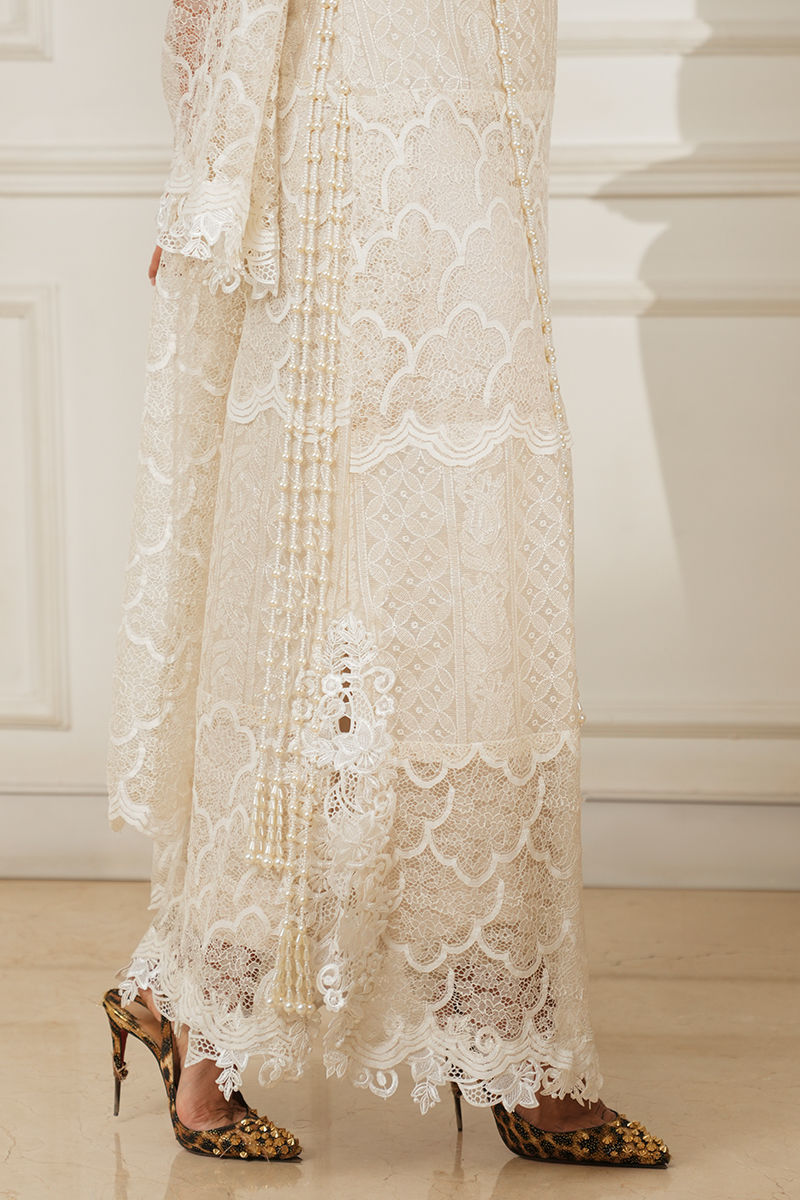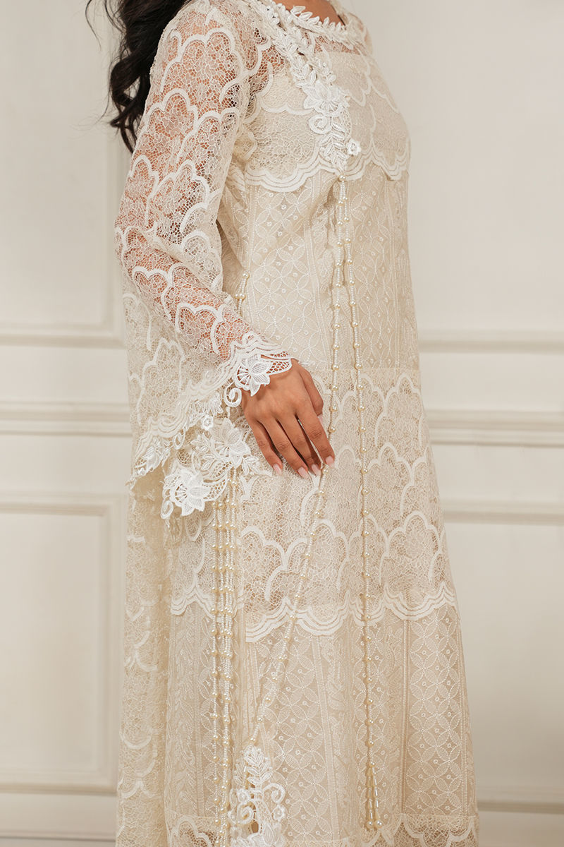 Chikankari cotton net shirt layered with lace net detailing, adorned with handmade pearl hangings along the sides and front. Finished with 3D floral bunches accenting the slits and daman for added dimension and elegance.