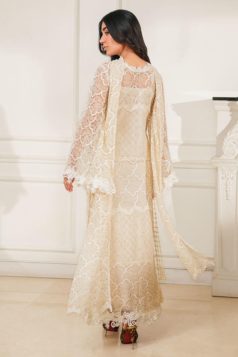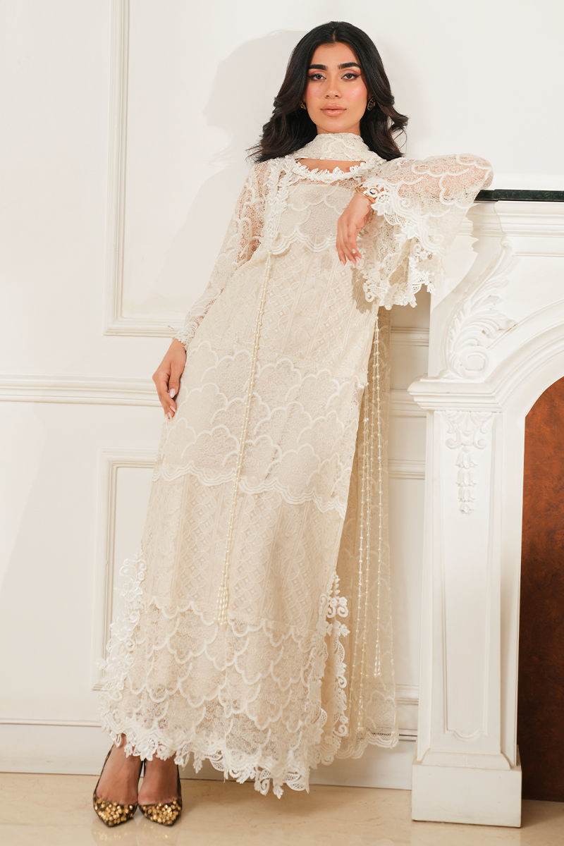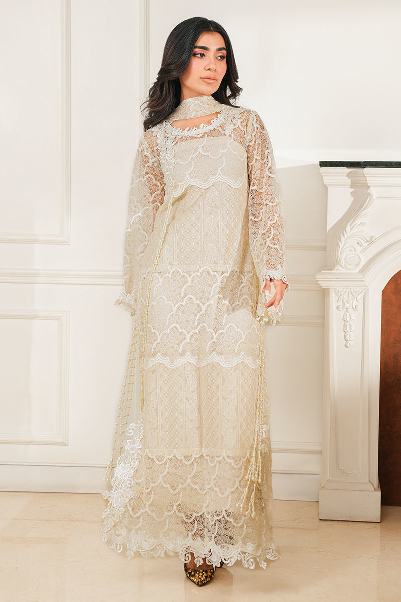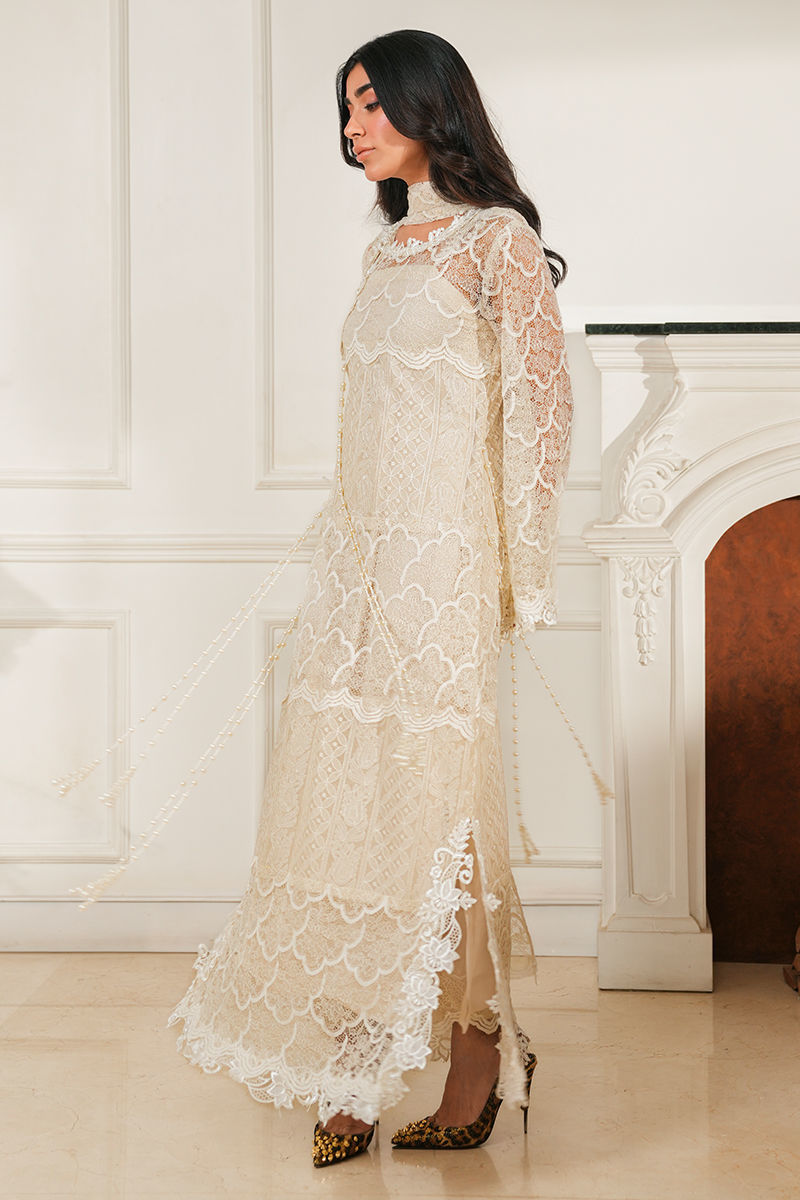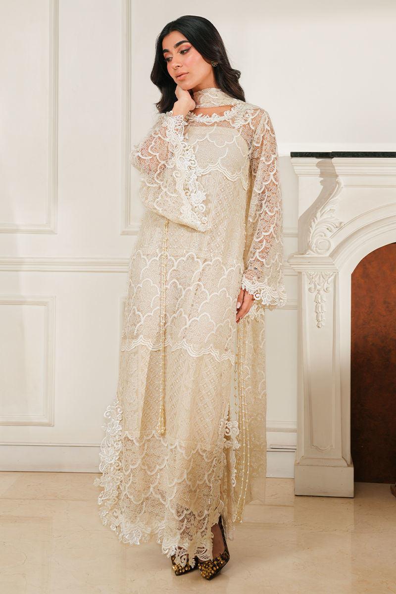 Chikankari cotton net shirt layered with lace net detailing, adorned with handmade pearl hangings along the sides and front. Finished with 3D floral bunches accenting the slits and daman for added dimension and elegance.