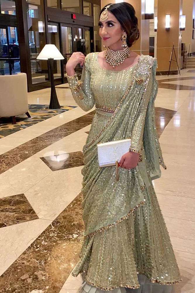A regal mint green worked lengha choli with handworked zardozi brooches, tassels and pleats detailing. Paired with a matching stitched pre-drapped dupatta (not attached to the choli). A separate dupatta to be worn on the head can be ordered as well. Length 44 inches Choli 14 inches Front neckline 7.5 inches Back neckline 10 4 inches heels * Dupatta can’t be sold separately.