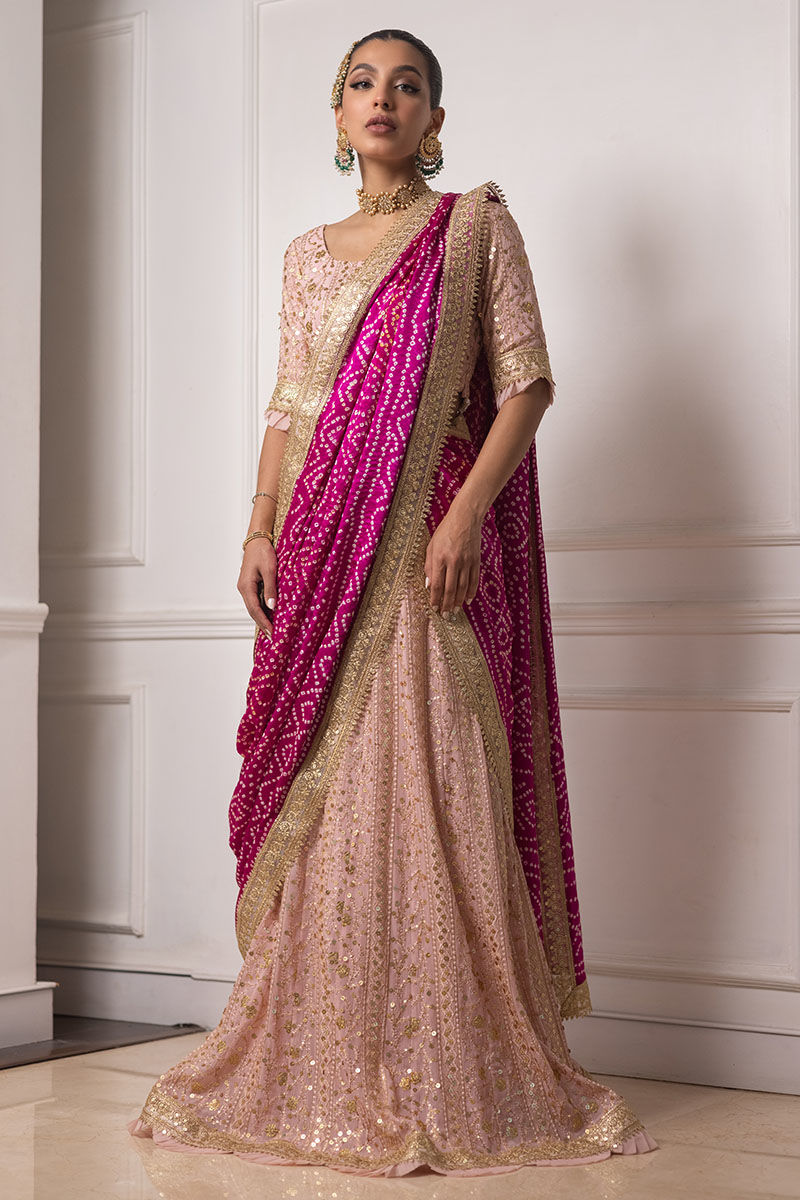 Embrace elegance in a pink georgette chiffon lengha choli adorned with intricate gold sequin work. The sleeves feature maroori borders with handmade scalloped pleats, while zardozi broaches embellished with pearls grace the back neckline. The lengha dazzles with gold maroori borders and scallop pleats at the hem, supported by cancan underneath. A pure silk magenta pink chunari dupatta completes the ensemble, enriched with gold maroori borders and delicate handmade tassels. This ensemble strikes a perfect balance between sophistication and drama.