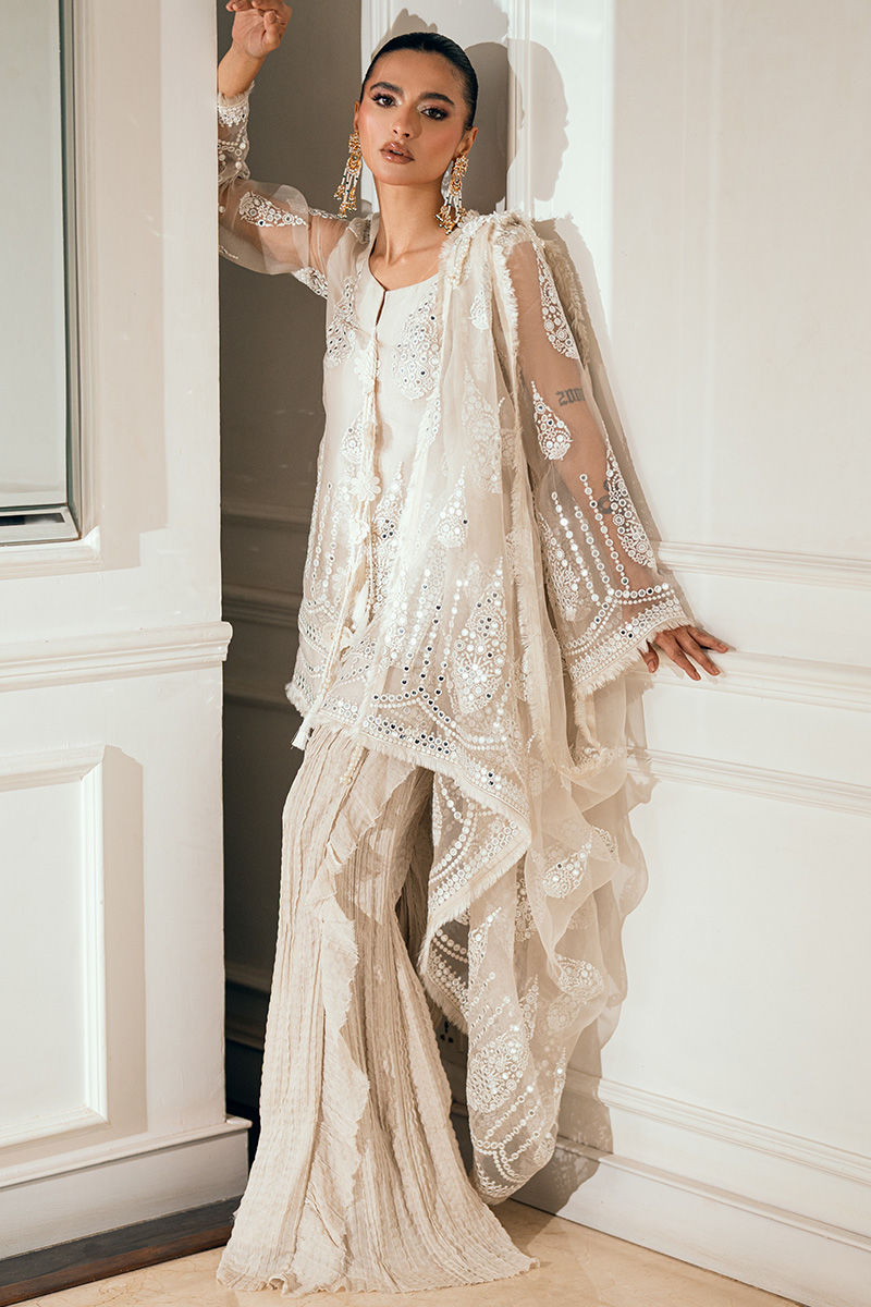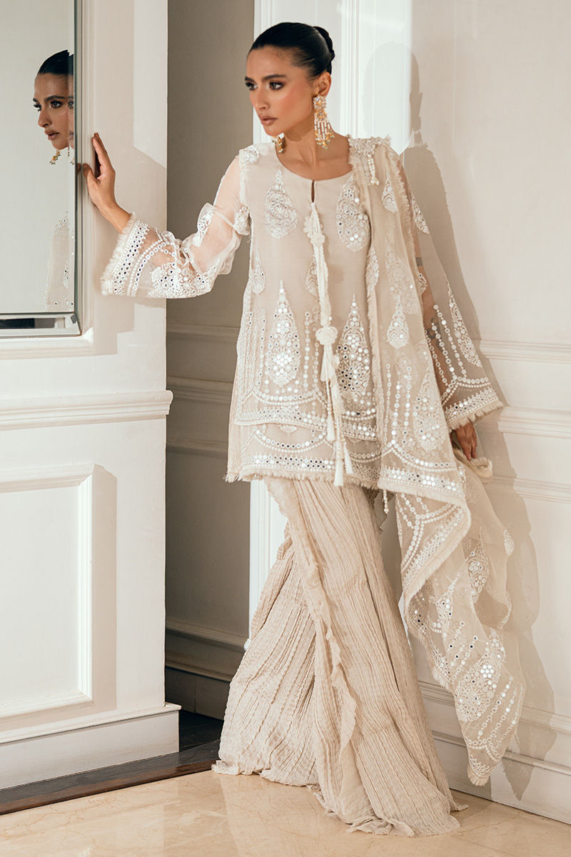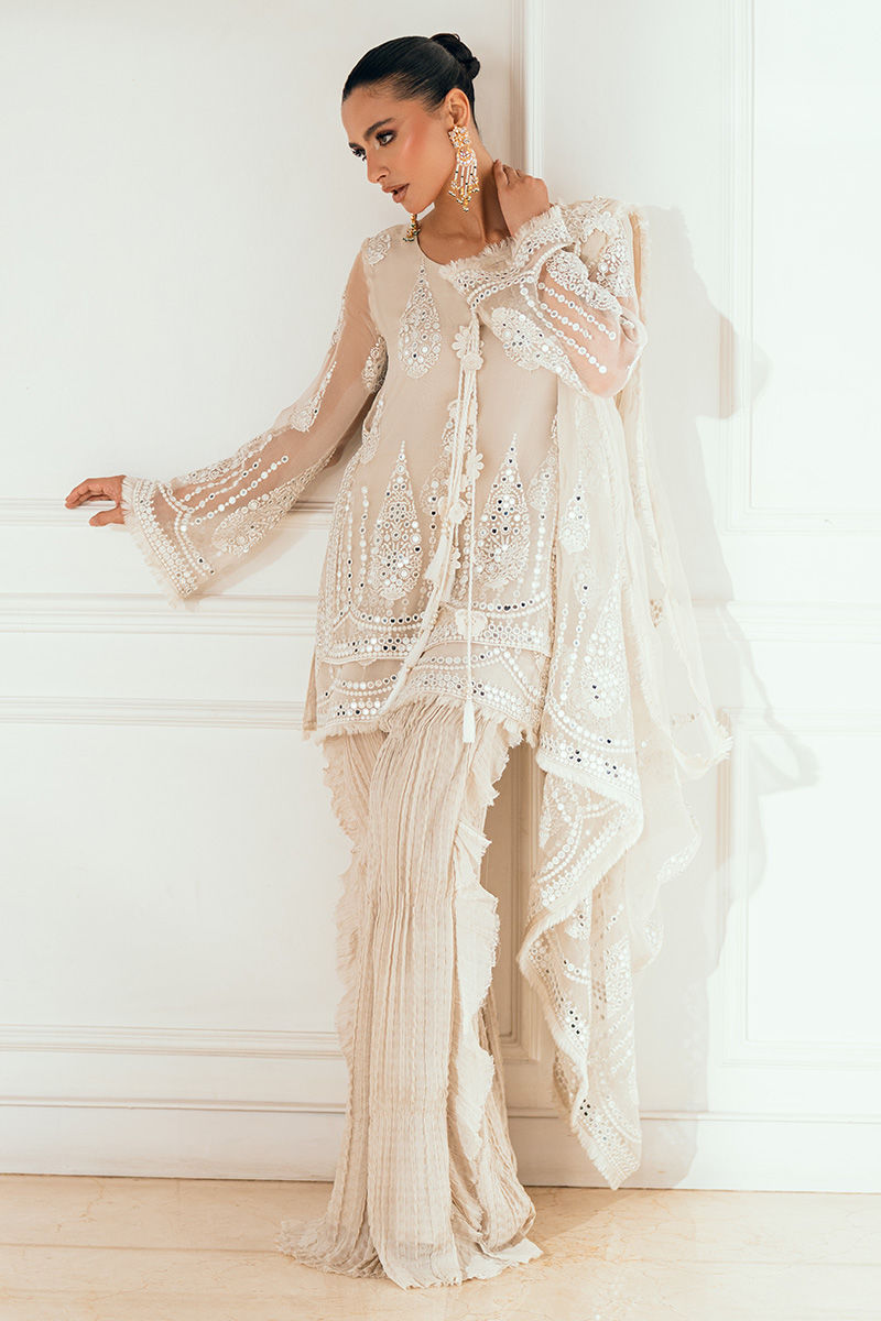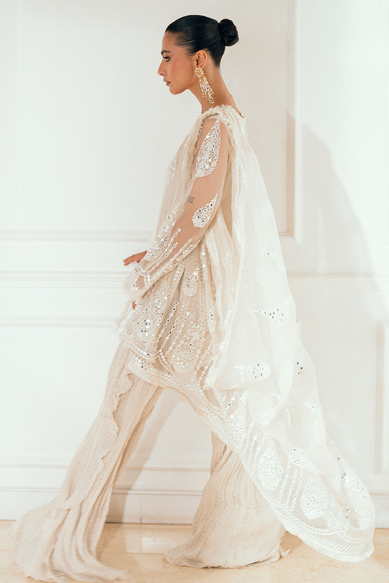 Kiran is an elegant ivory pure organza double-layered shirt adorned with intricate thread and foil embroidery, featuring handmade thread and 3D floral tassels on the neckline. It is paired with chiffon crush pants lined with cotton silk for comfort, and a draped pure organza dupatta decorated with foil and thread work, 3D floral accents, and handmade pearl tassels for a refined finish.