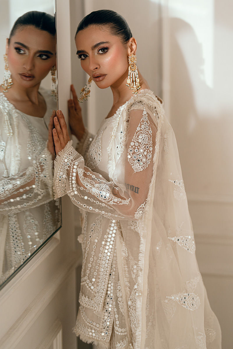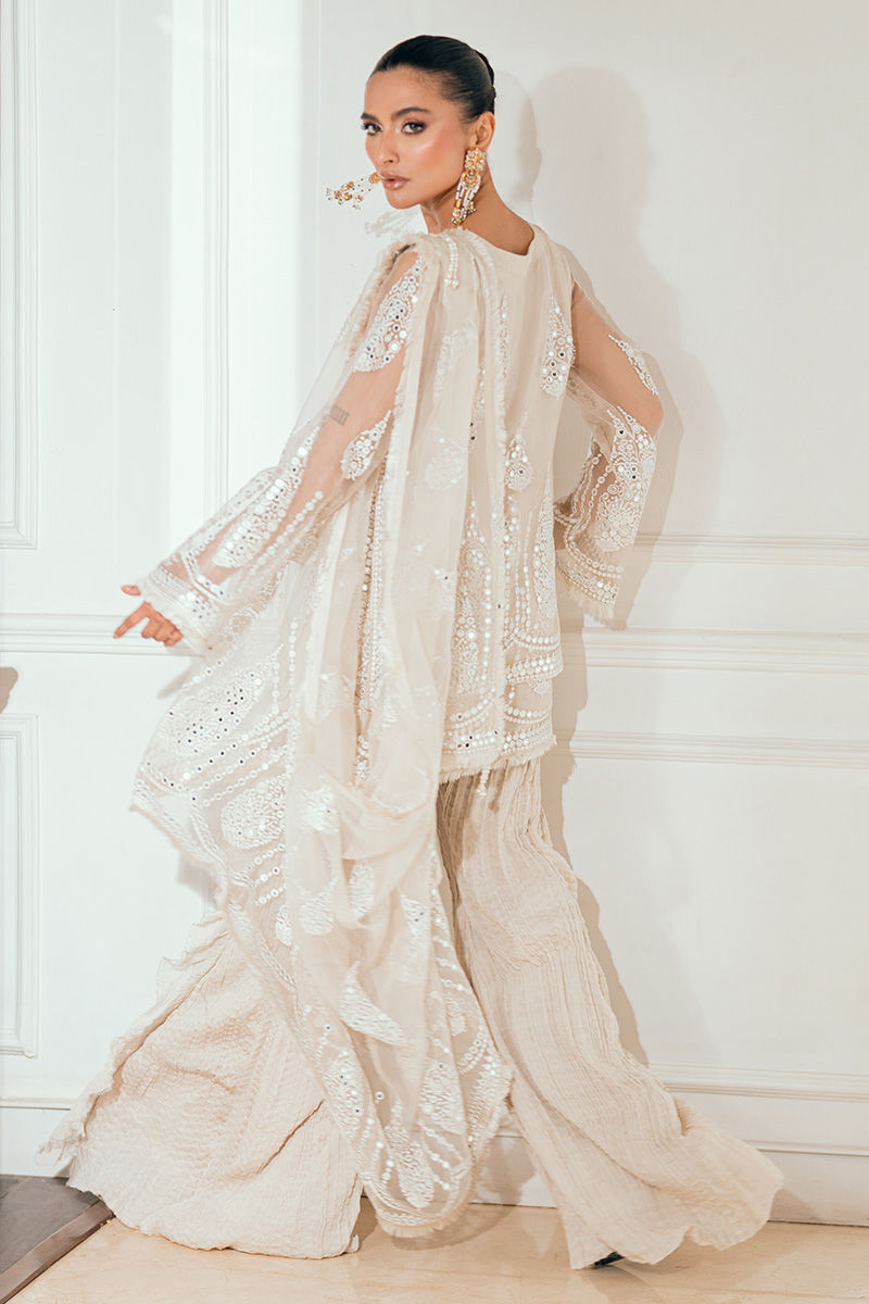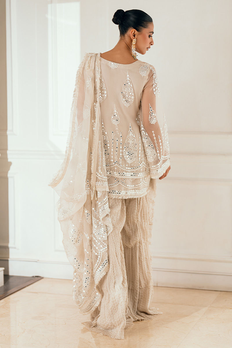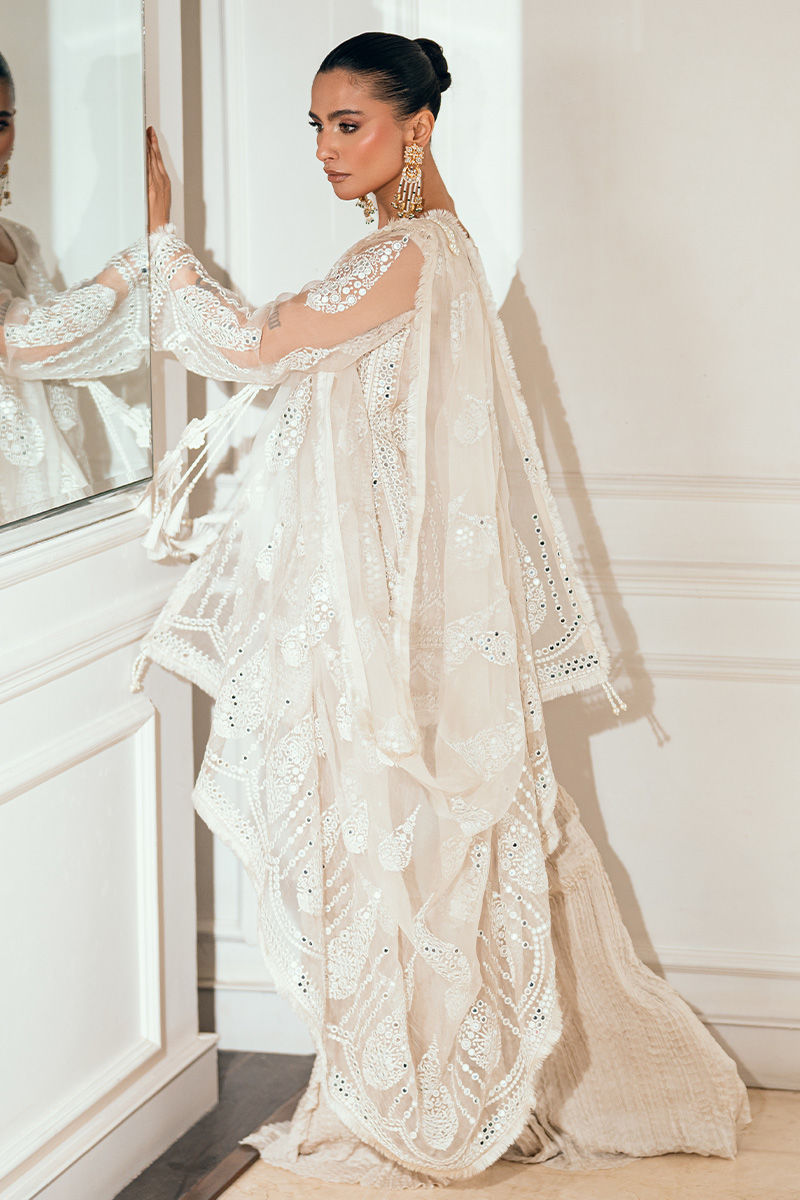 Kiran is an elegant ivory pure organza double-layered shirt adorned with intricate thread and foil embroidery, featuring handmade thread and 3D floral tassels on the neckline. It is paired with chiffon crush pants lined with cotton silk for comfort, and a draped pure organza dupatta decorated with foil and thread work, 3D floral accents, and handmade pearl tassels for a refined finish.