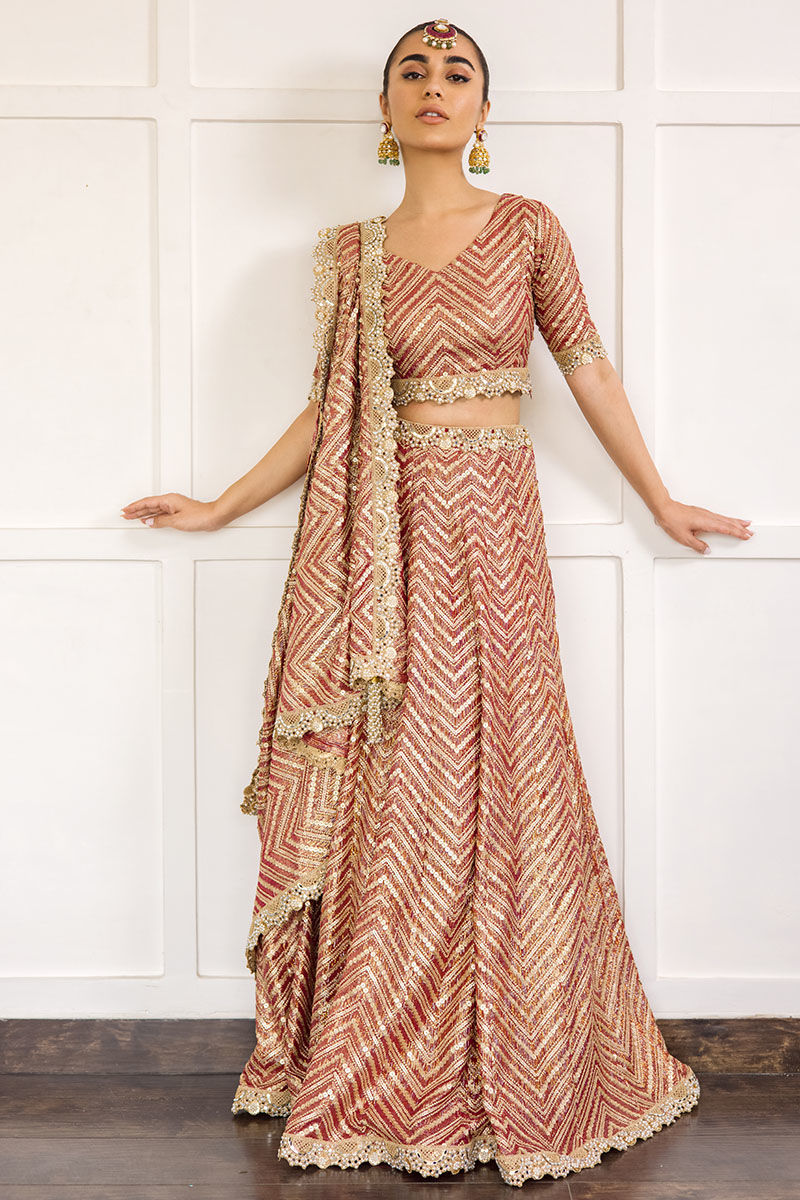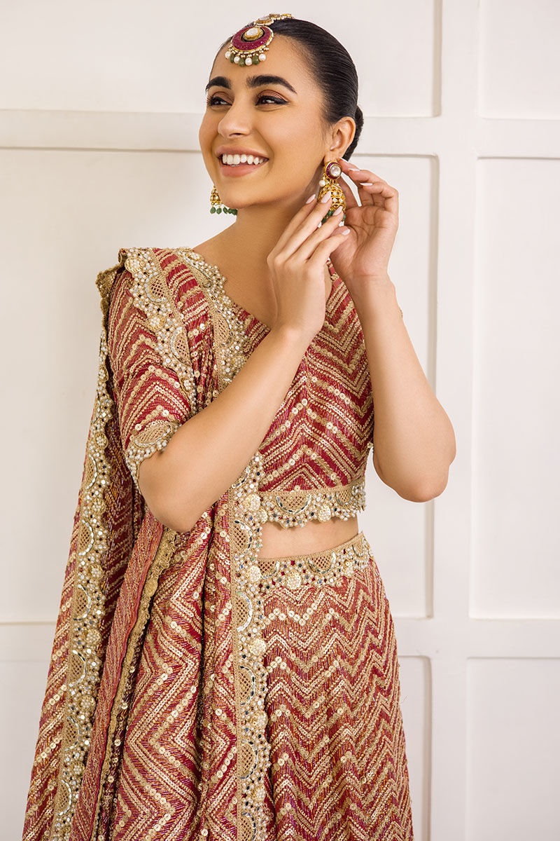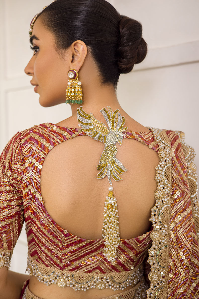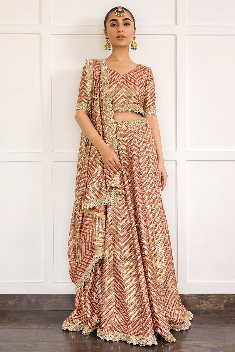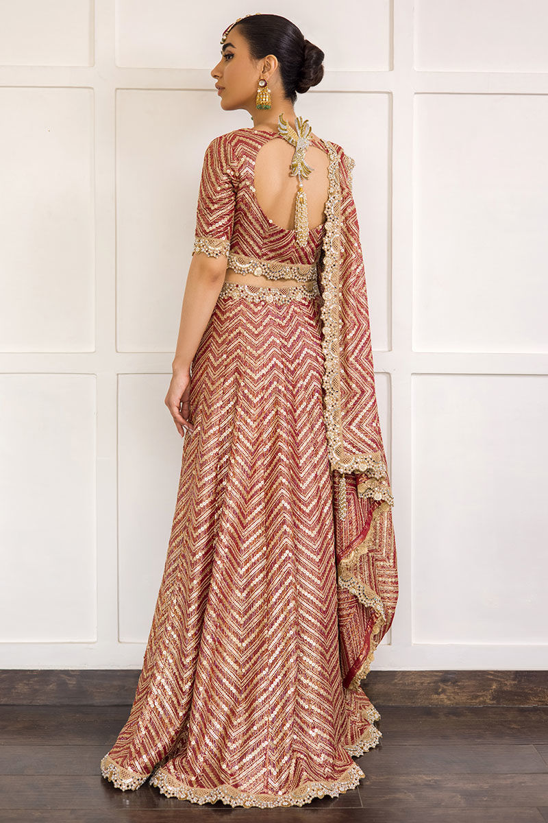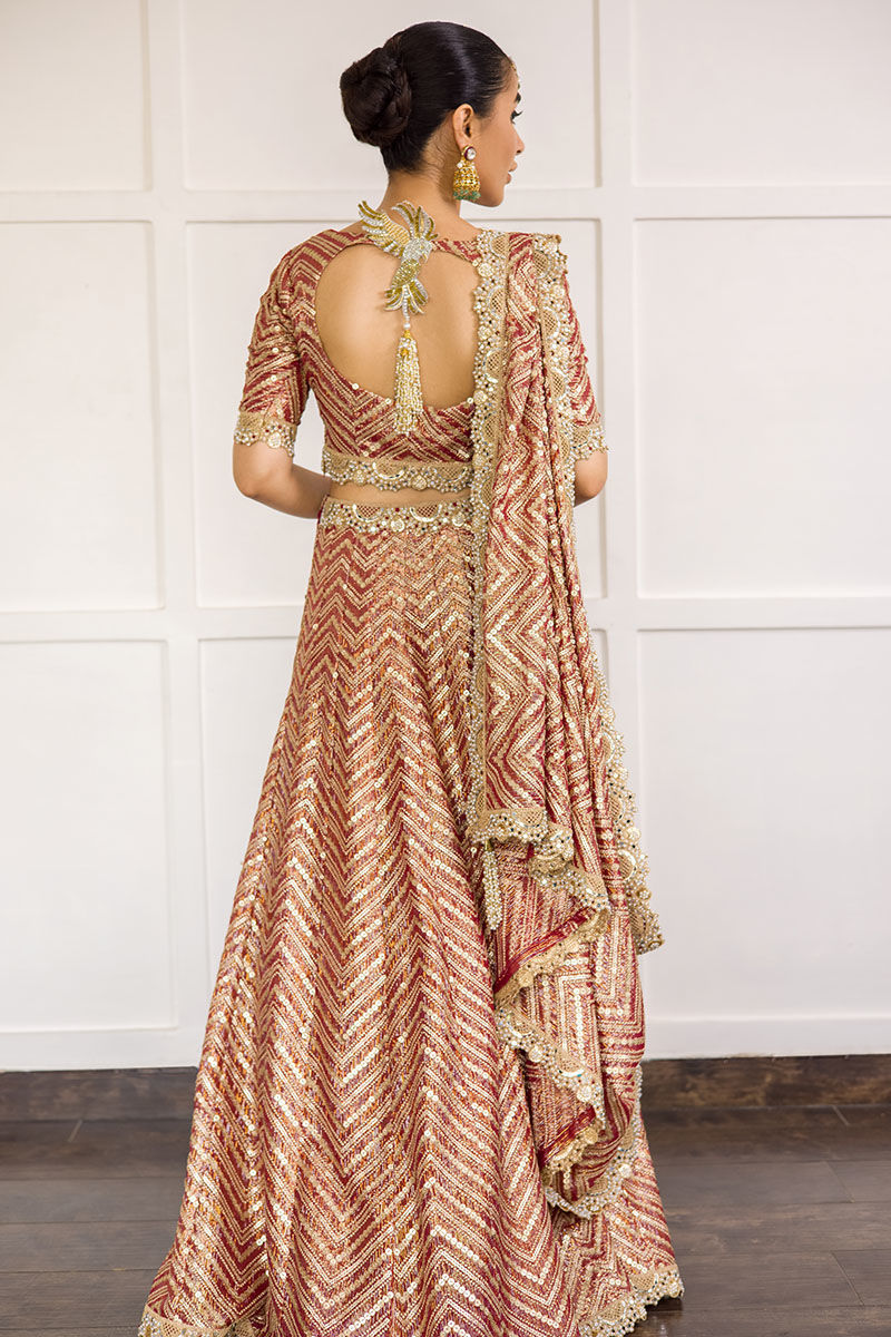 Stunning red and gold hued lehnga detailed with sequins and self embroidery is accentuated with gorgeous hand worked scalloped border on the choli, lehnga and dupatta. The mesmerising back details featuring handworked zardozi brooch and tassel.