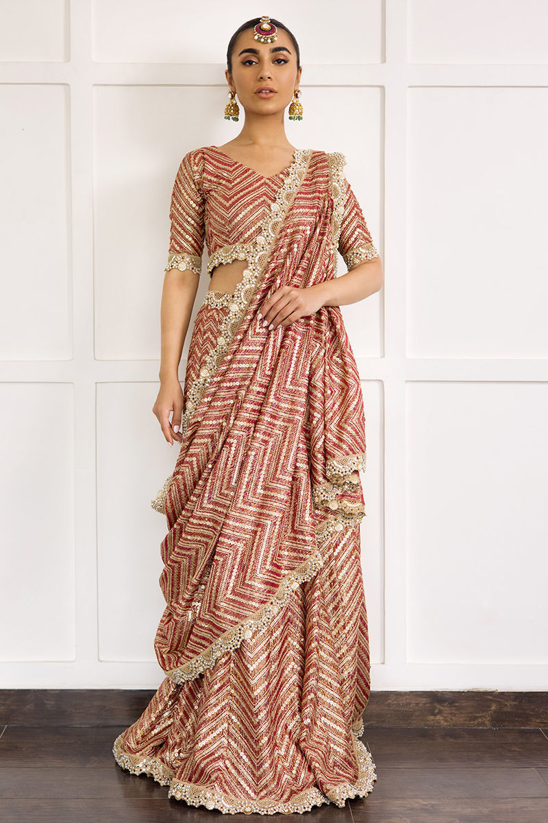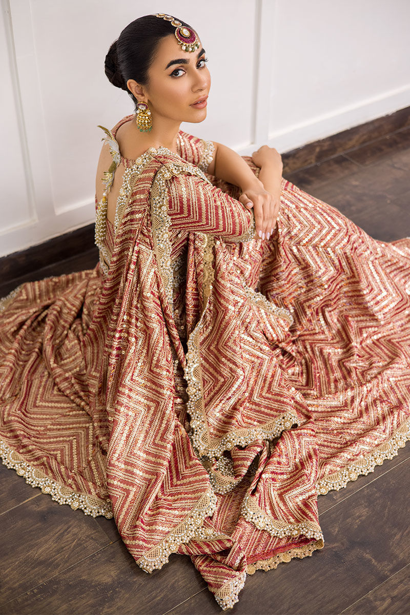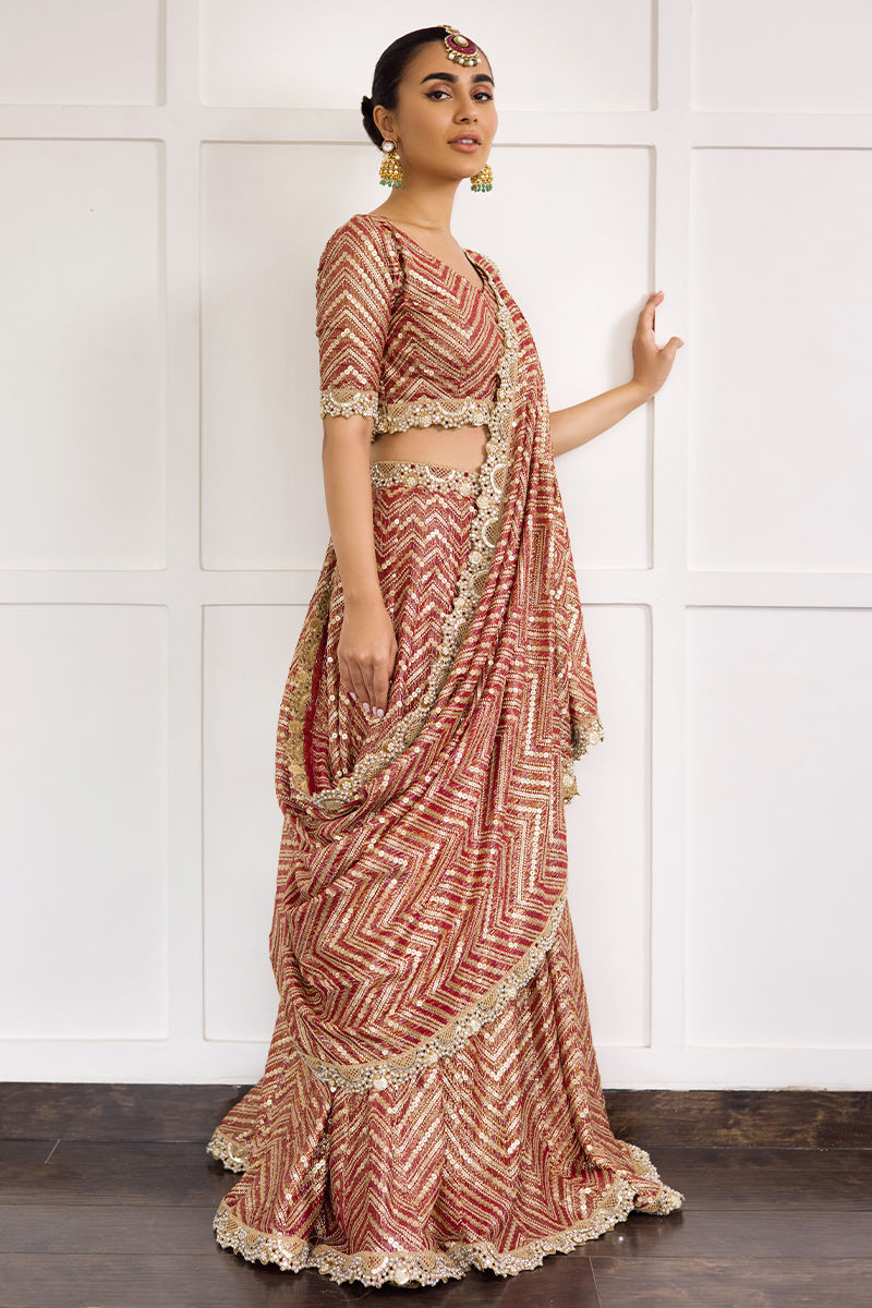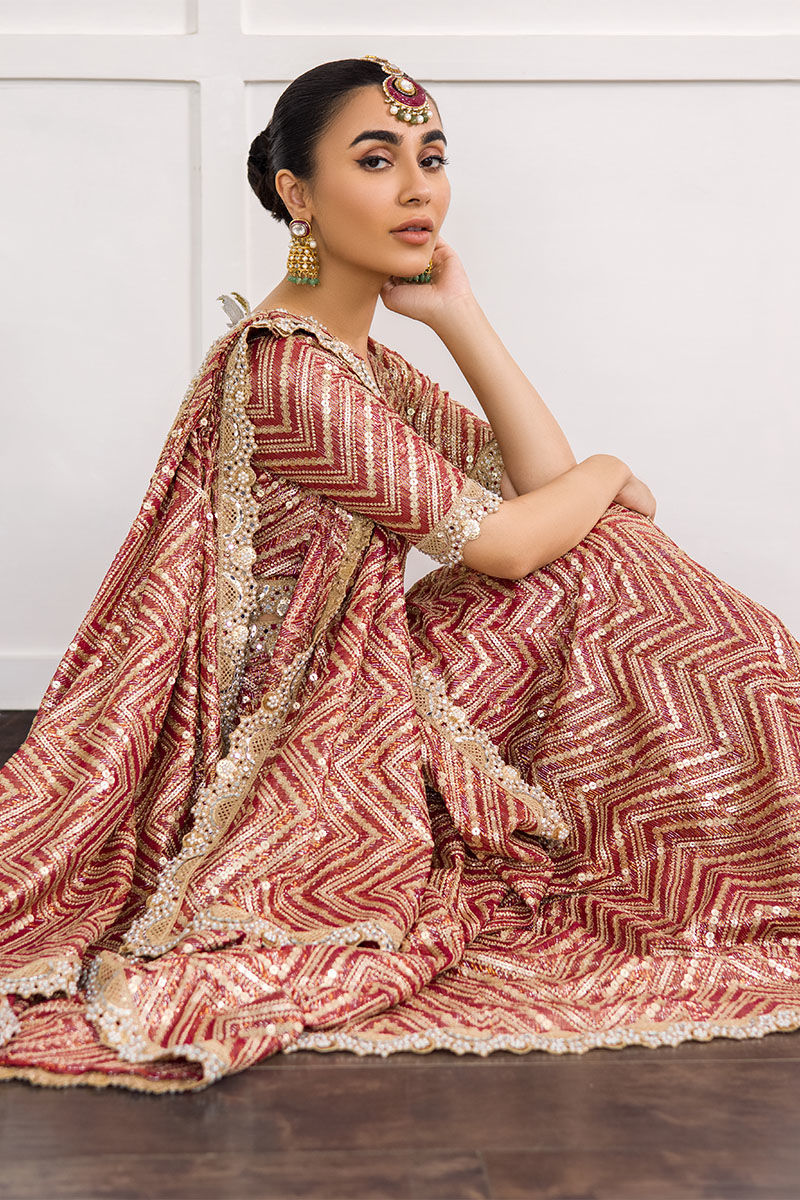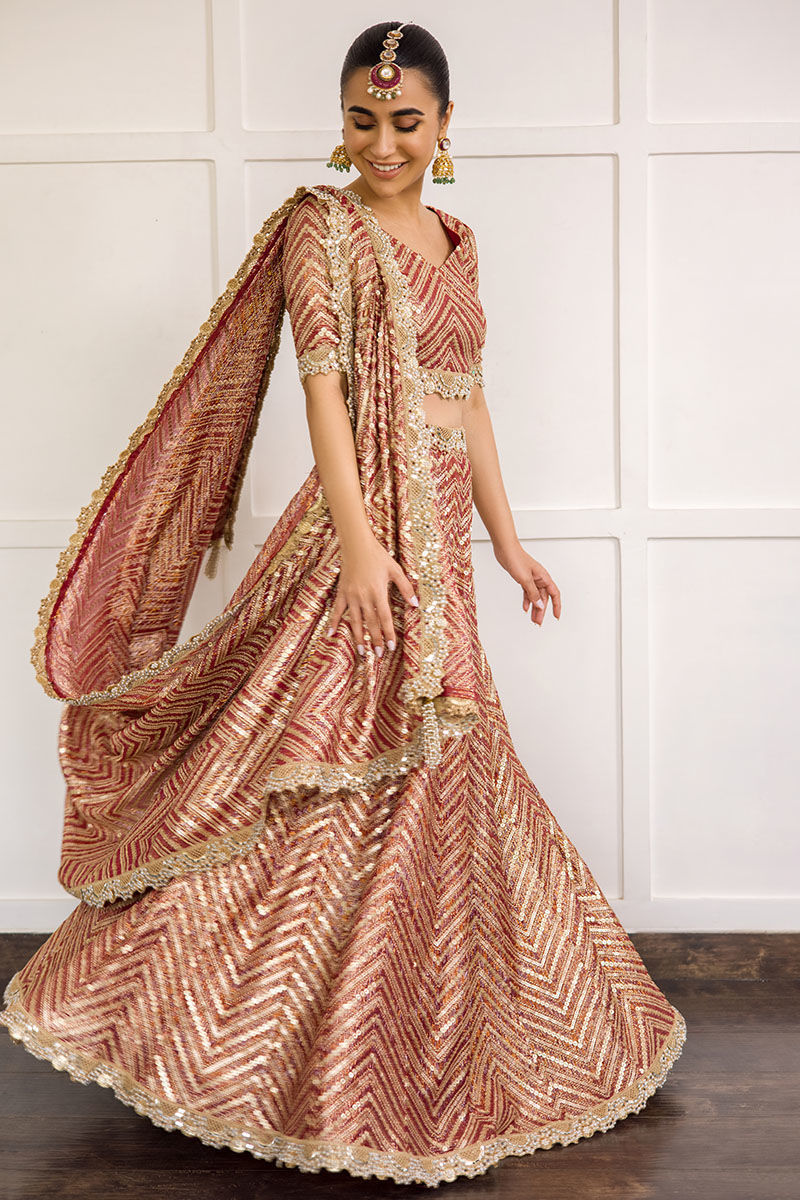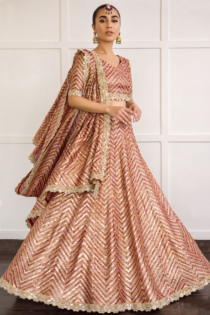 Stunning red and gold hued lehnga detailed with sequins and self embroidery is accentuated with gorgeous hand worked scalloped border on the choli, lehnga and dupatta. The mesmerising back details featuring handworked zardozi brooch and tassel.