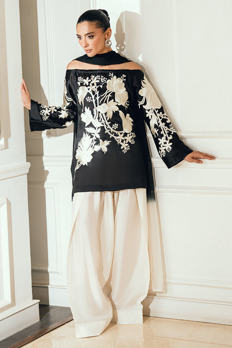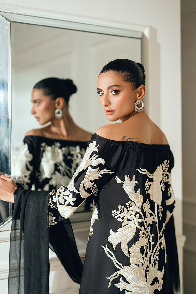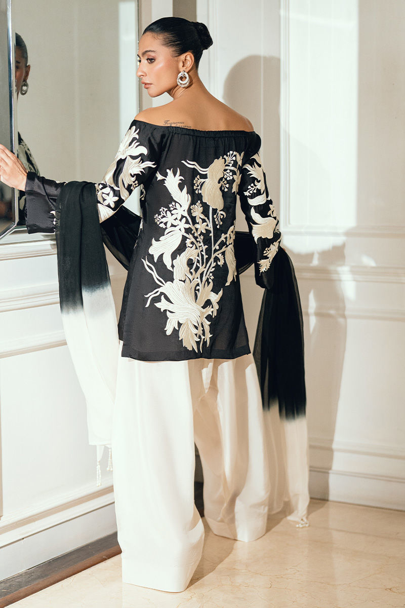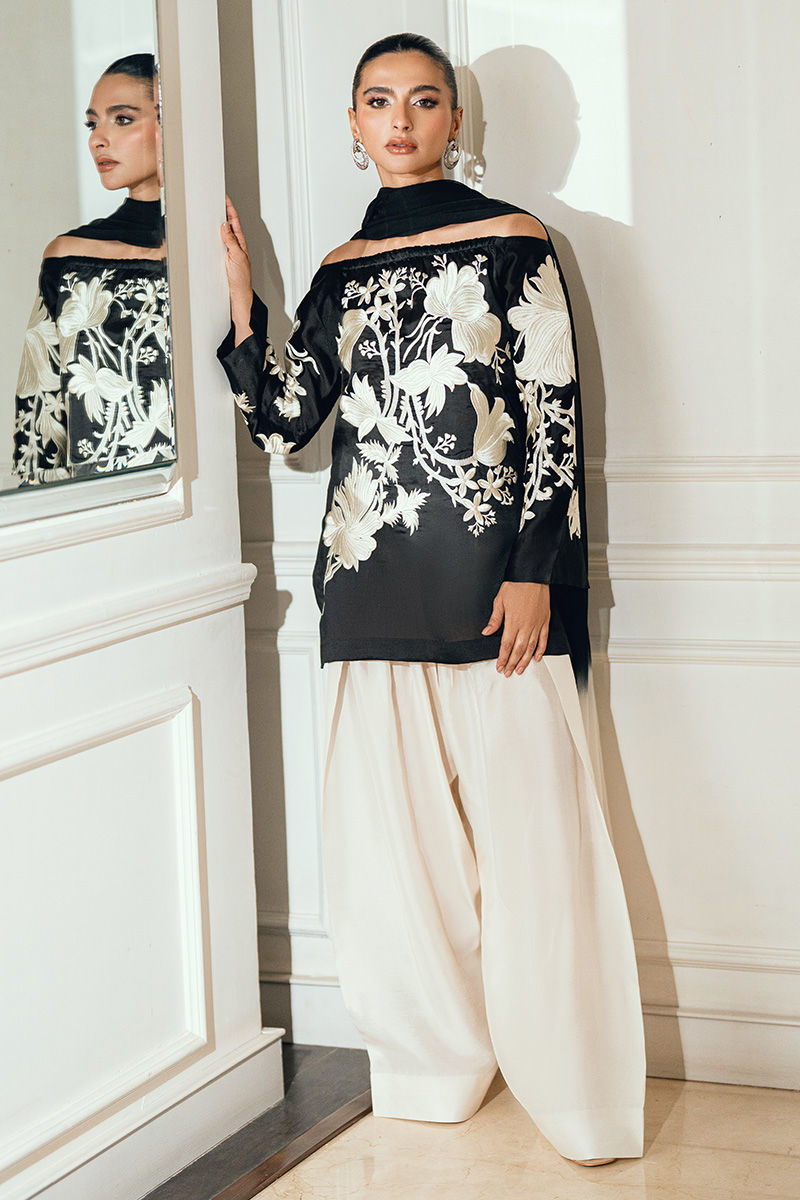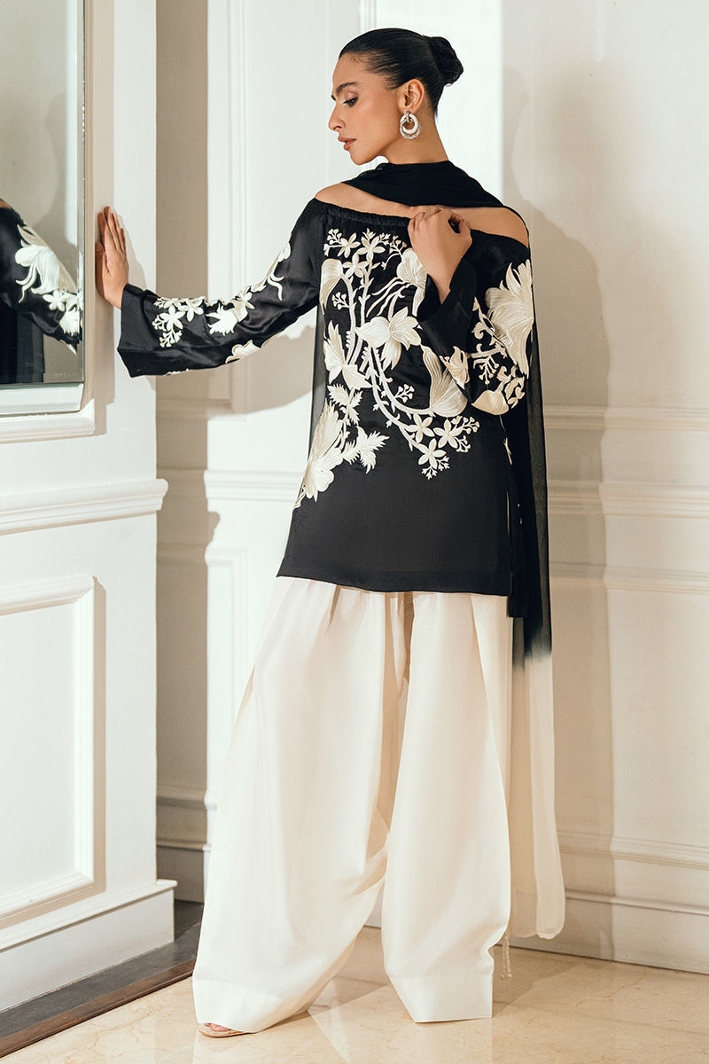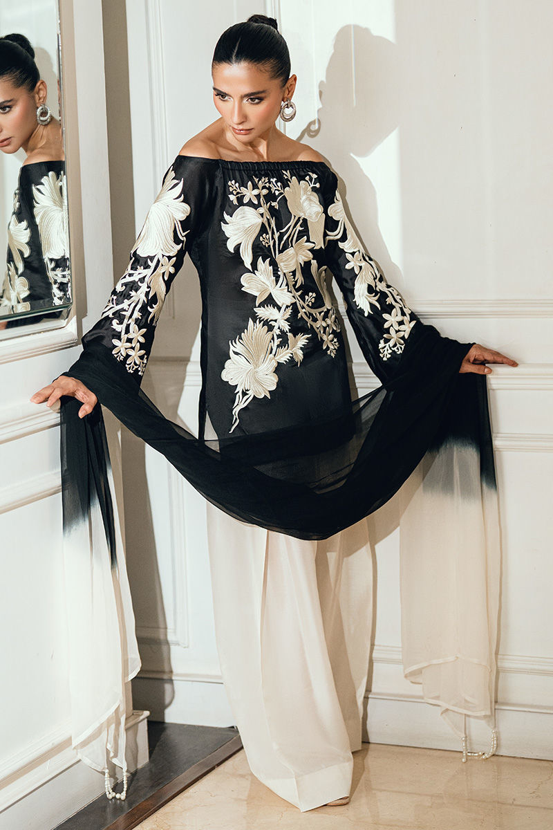 Mehmal is an elegant black silk shirt featuring delicate white thread embroidery on both the front and back, paired with a flowing silk farshi shalwar for a sophisticated silhouette. The ensemble is completed with a two-tone chiffon dupatta, adorned with pearl tassels on all four sides for a refined finish.