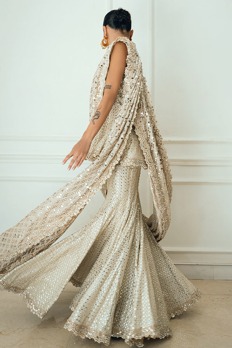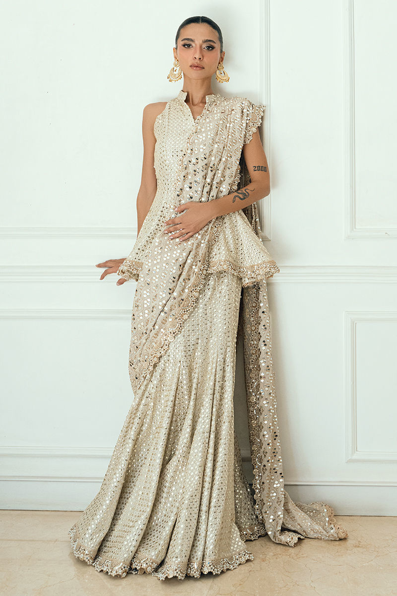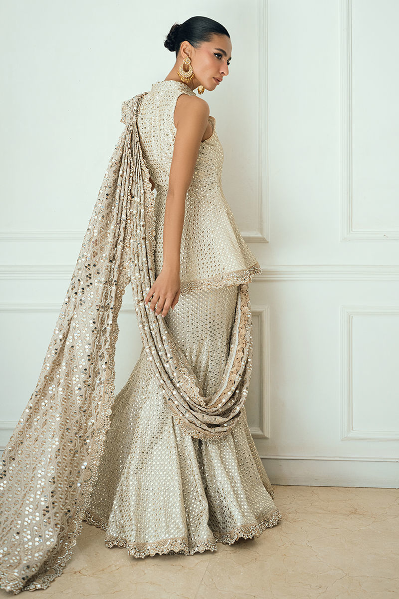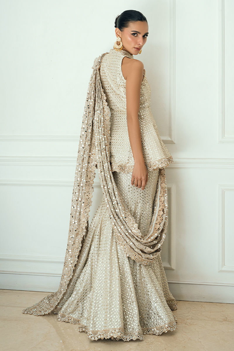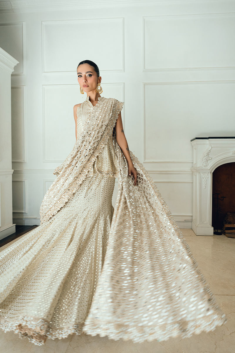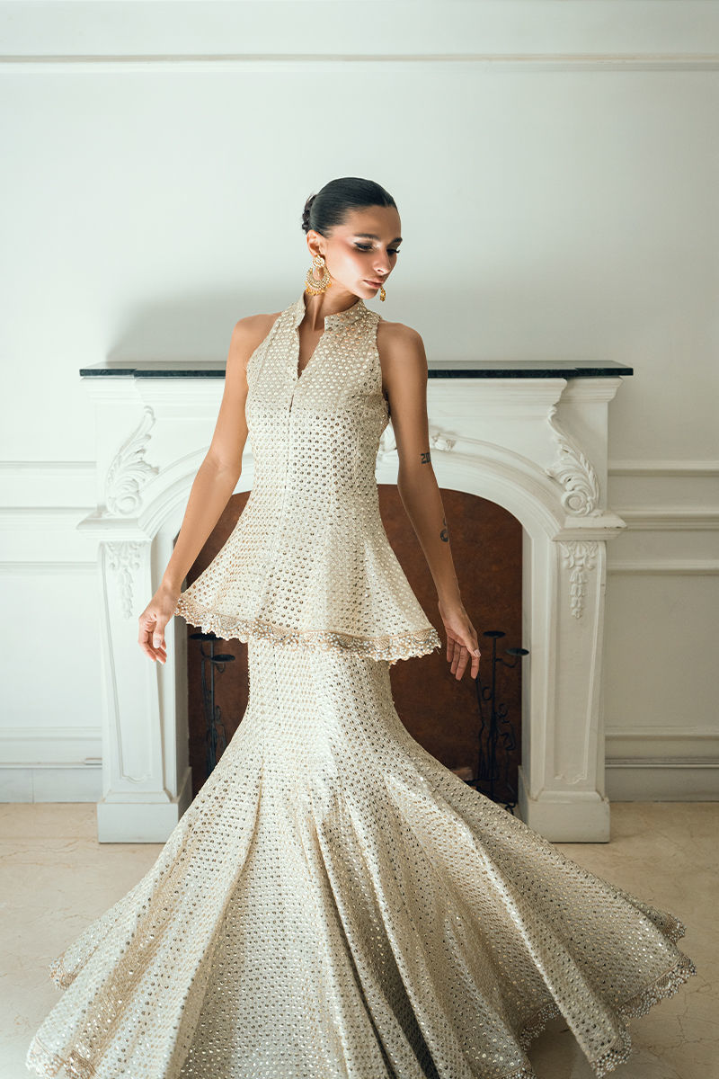 A luxurious ivory ensemble adorned with intricate embroidered and hand-embellished detailing. The refined craftsmanship adds depth, shimmer, and a regal appeal to the design. Perfectly curated for grand festive celebrations and formal evenings.