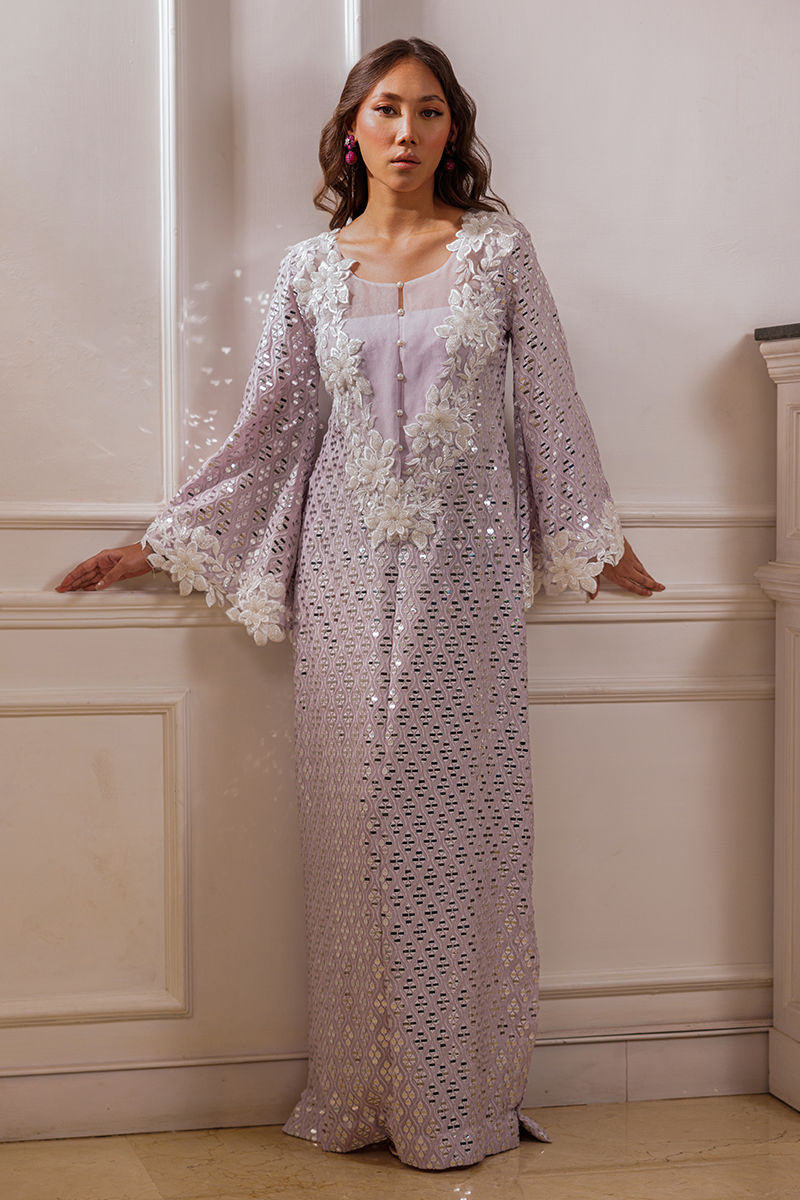 The Myza lavender silk kaftaan shirt features intricate embroidery and foil work, enhanced by cutwork 3D floral details on the neckline. Pearls embellish both the front and back neckline, as well as the sleeves, adding a touch of elegance. The shirt is designed with a side slit for added flair.