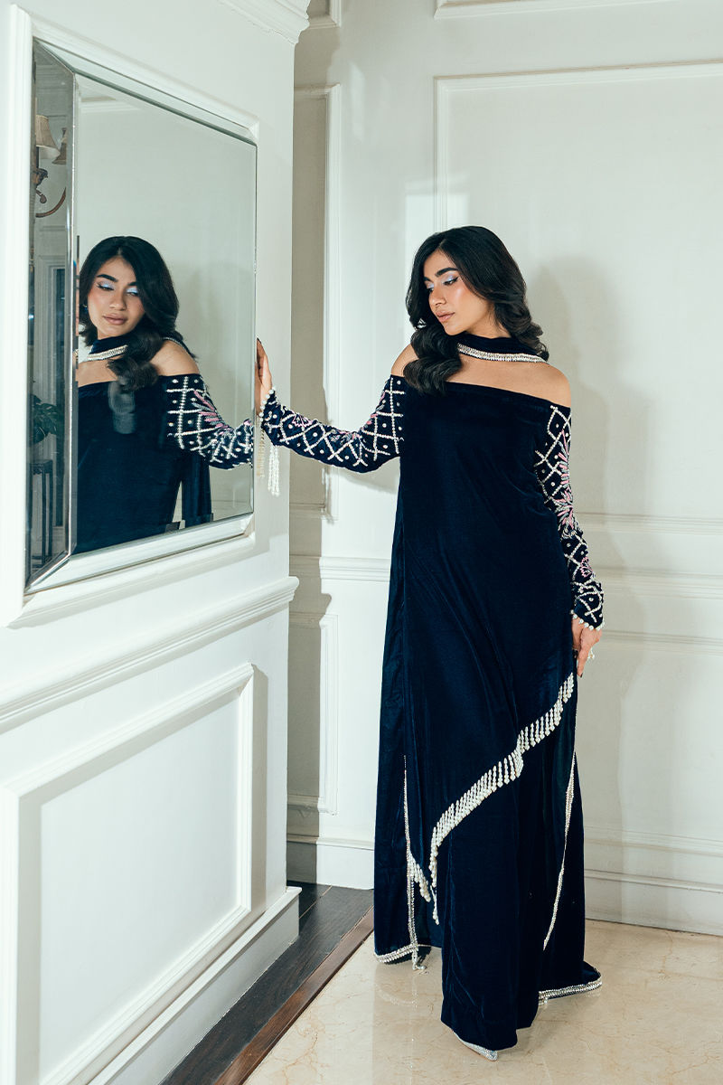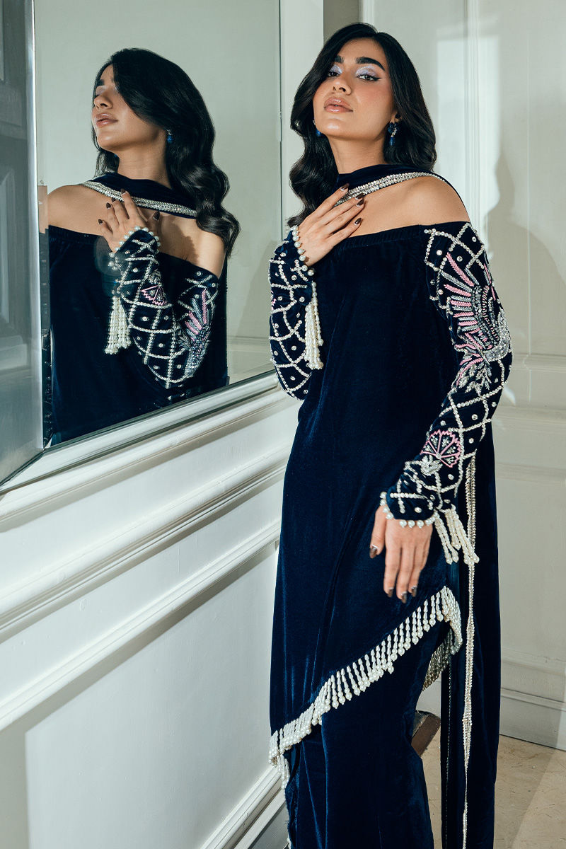 Natty blue velvet slanted-cut shirt features handmade pearl tassels on the hem and sleeves, along with diamante-worked sleeves highlighted with thread and zardozi embellishments.