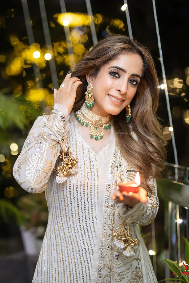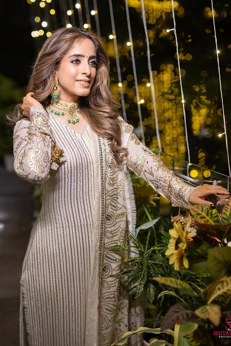 Nisha is an elegant off-white chiffon ensemble featuring intricate sequin work on both the shirt and pants. The outfit is complemented with a full sequin jaal dupatta, attached to the shirt for a cohesive and luInurious look. The shirt and pants are lined with cotton silk for comfort, while handmade threadwork on the shirt and delicate tassels on the sleeves add refined detailing. Shirt length 52 inches. Pants length 44 inches. Front neckline 7.5 inches.