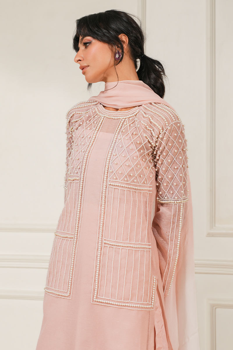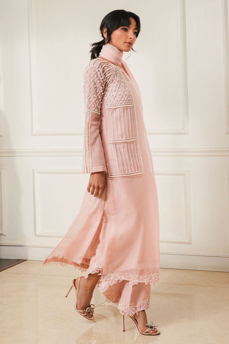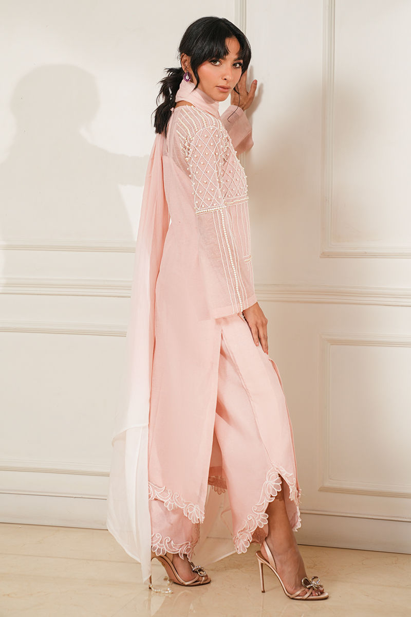 Pink cotton net ensemble featuring hand-embellished pearl work on the shirt and sleeves, complemented by delicate floral appliqué cutwork on both shirt and pants. Paired with a flowing double-shade chiffon dupatta for a soft, elegant finish