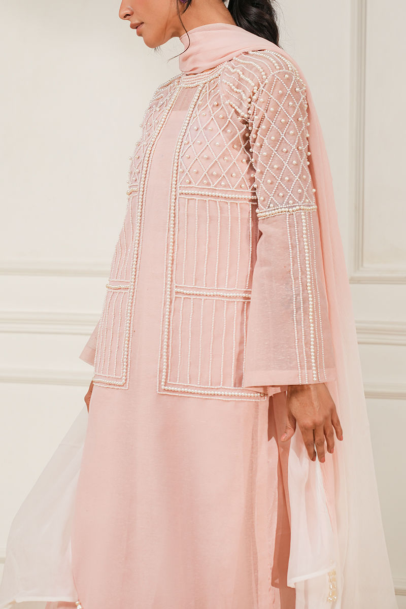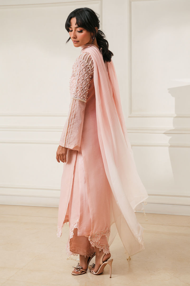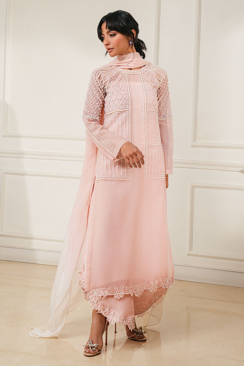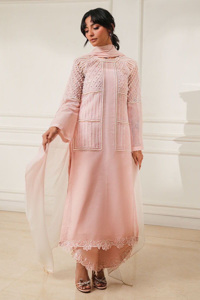 Pink cotton net ensemble featuring hand-embellished pearl work on the shirt and sleeves, complemented by delicate floral appliqué cutwork on both shirt and pants. Paired with a flowing double-shade chiffon dupatta for a soft, elegant finish