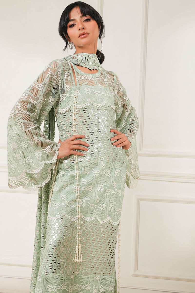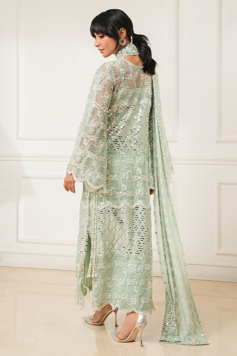 Lace and gorgette chiffon foil work on the shirt and handmade pearls tassels on the side and front