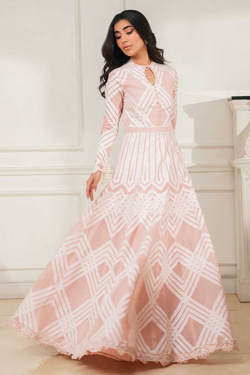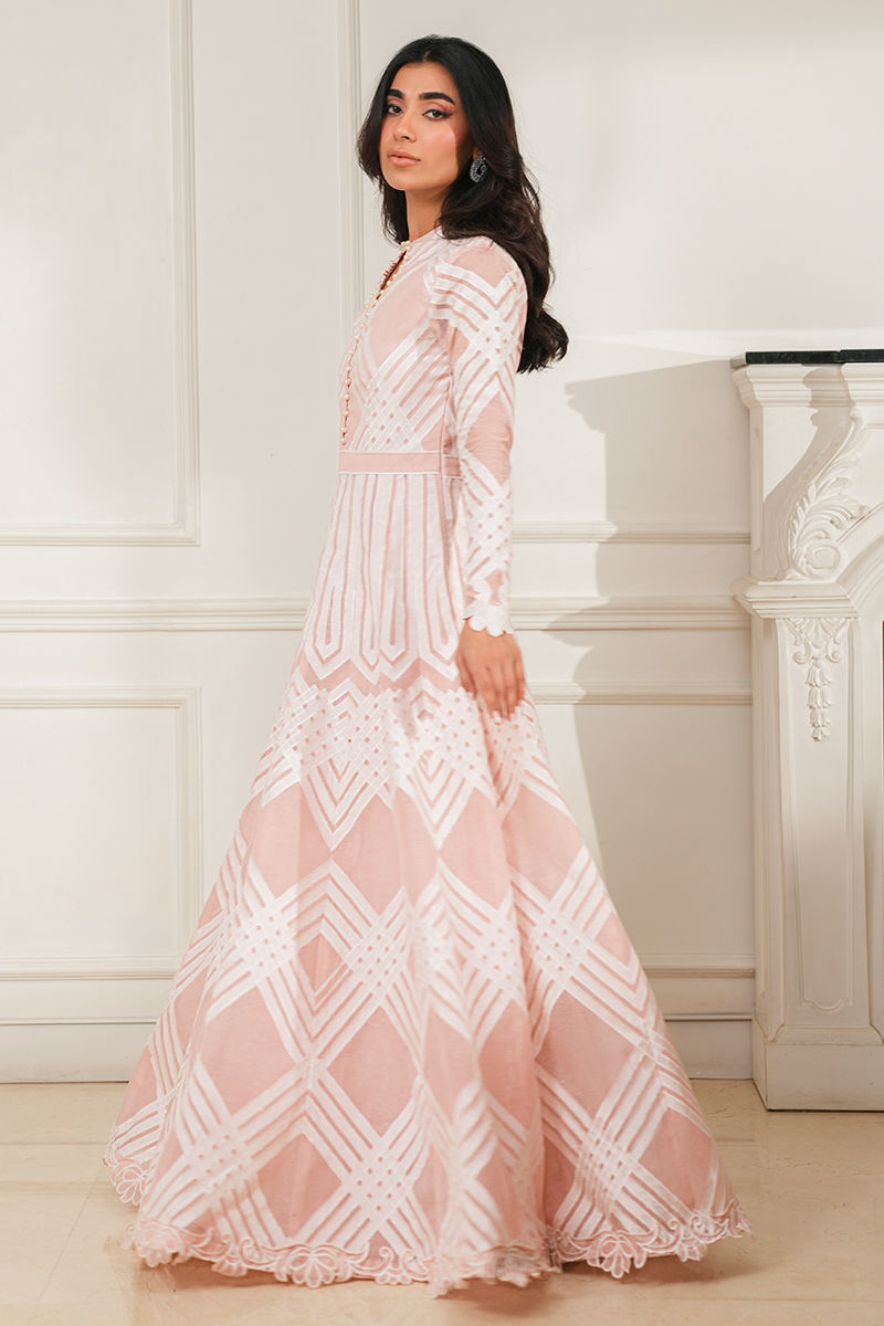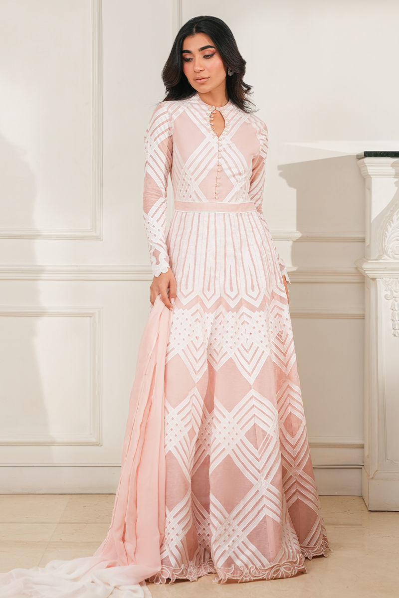 Kora cotton peshwas adorned with handmade appliqué cutwork all over, finished with pearl tassels on the sleeves and a delicate cutwork border along the hem.