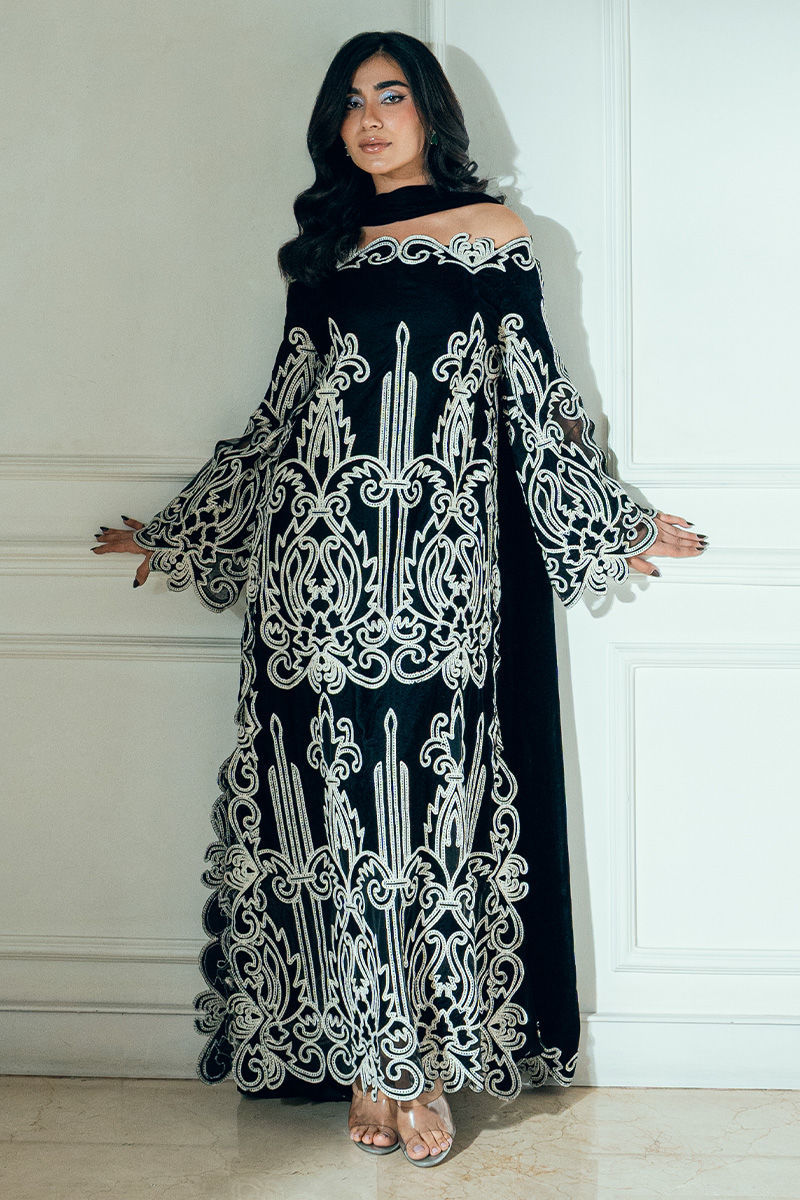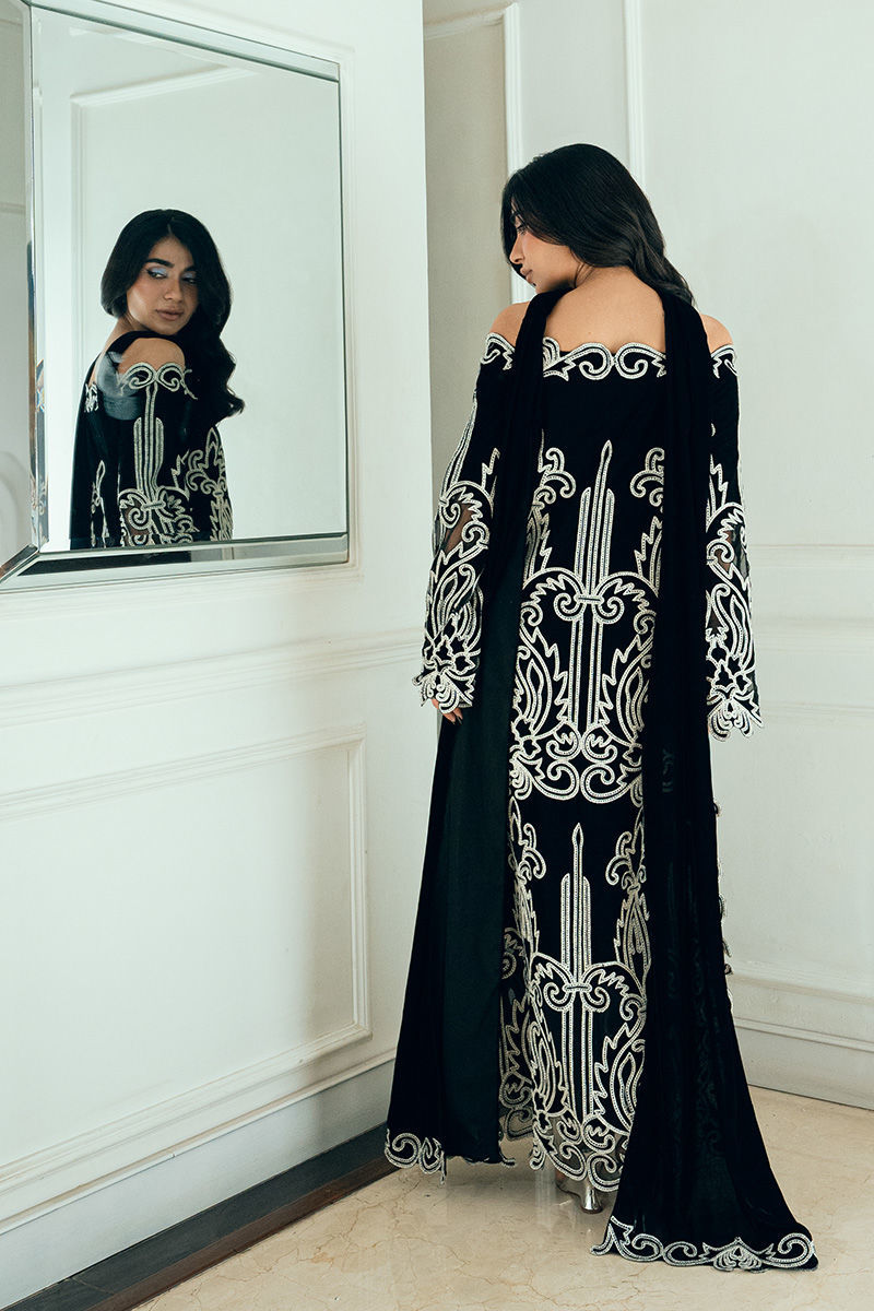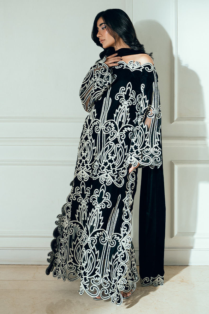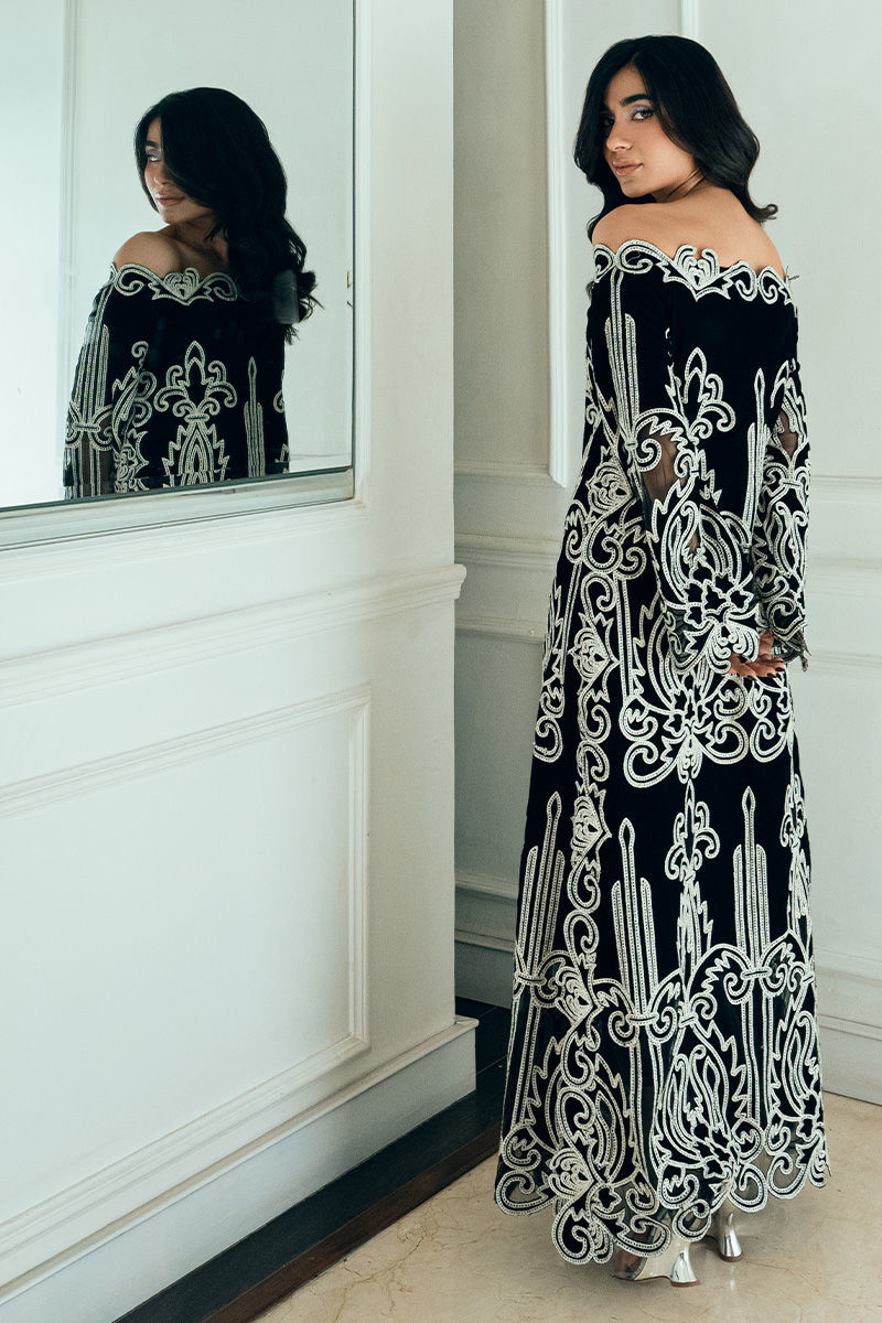 Raya black velvet off-shoulder shirt boasts appliqué cutwork Aari detailing on the front, back, and sleeves for a bold, sculpted look.