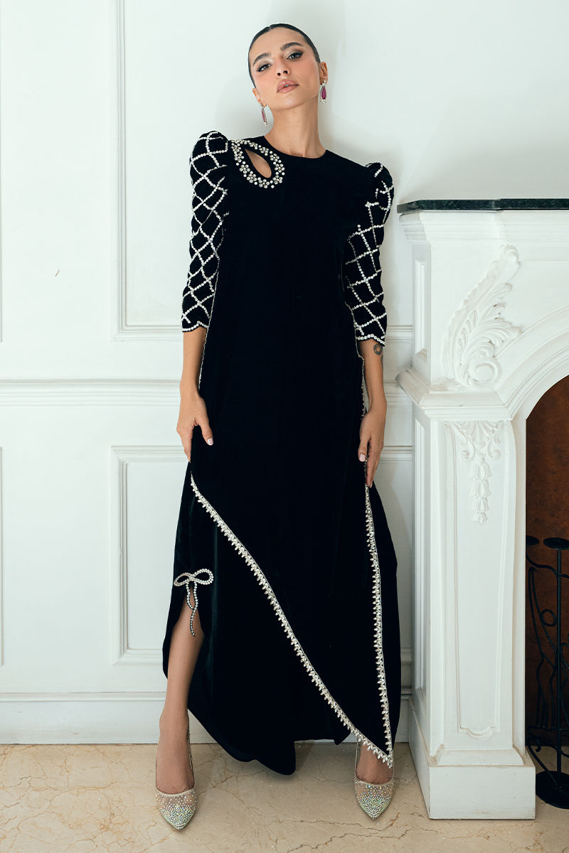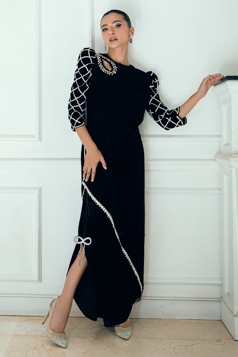 Rhea black velvet shirt and pants set showcases handmade diamante and pearl embellishments on the neckline and sleeves, paired with diamante borders on the damaan and sides. Styled with butterfly pants featuring a 3D butterfly accent.