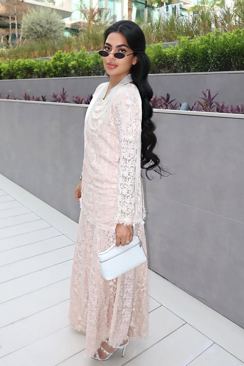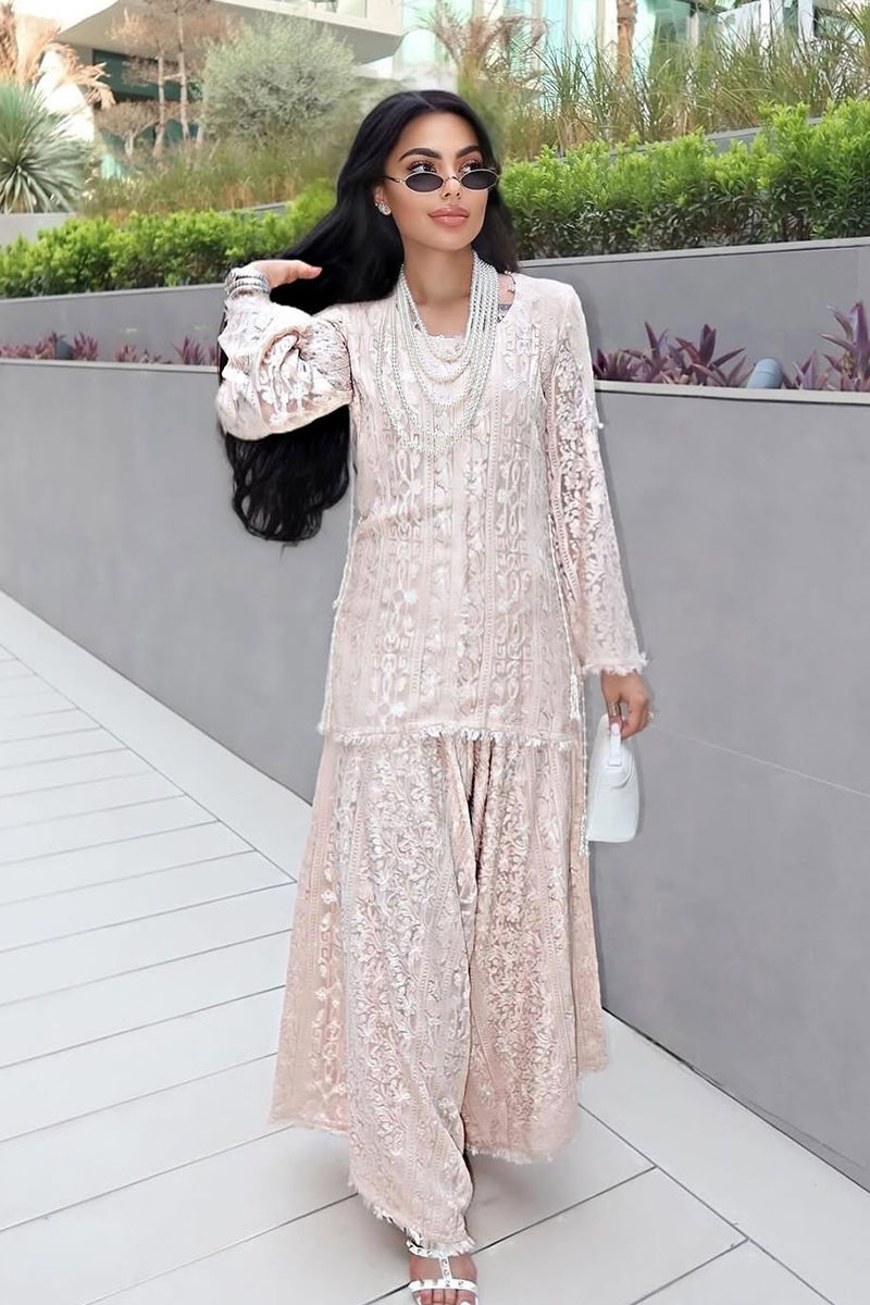 A pink self embroidered set with pearls danglings on the sides and sleeves of the shirt with thread bails on it. Shirt length 27 Inches Pants length 36 Inches Front neckline 7.5 Inches
