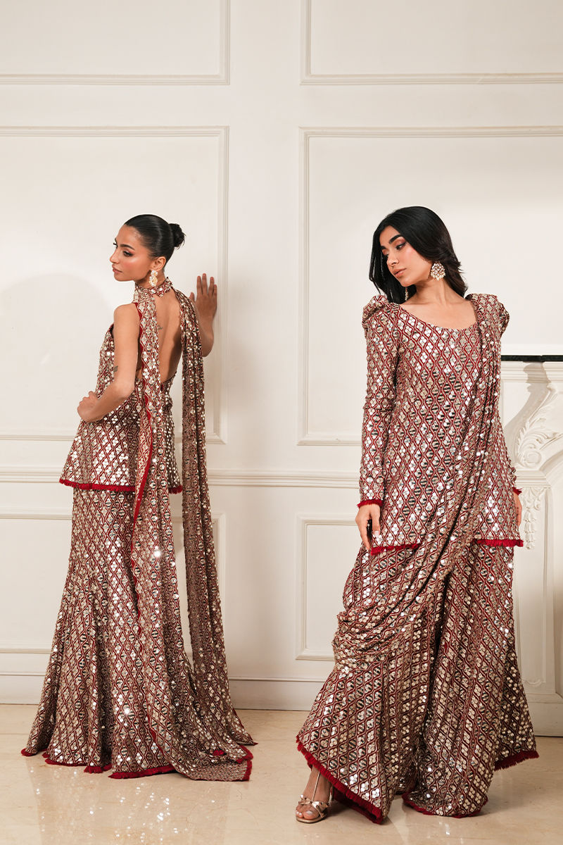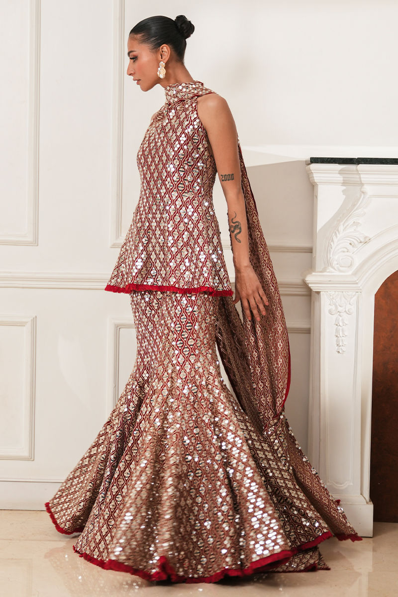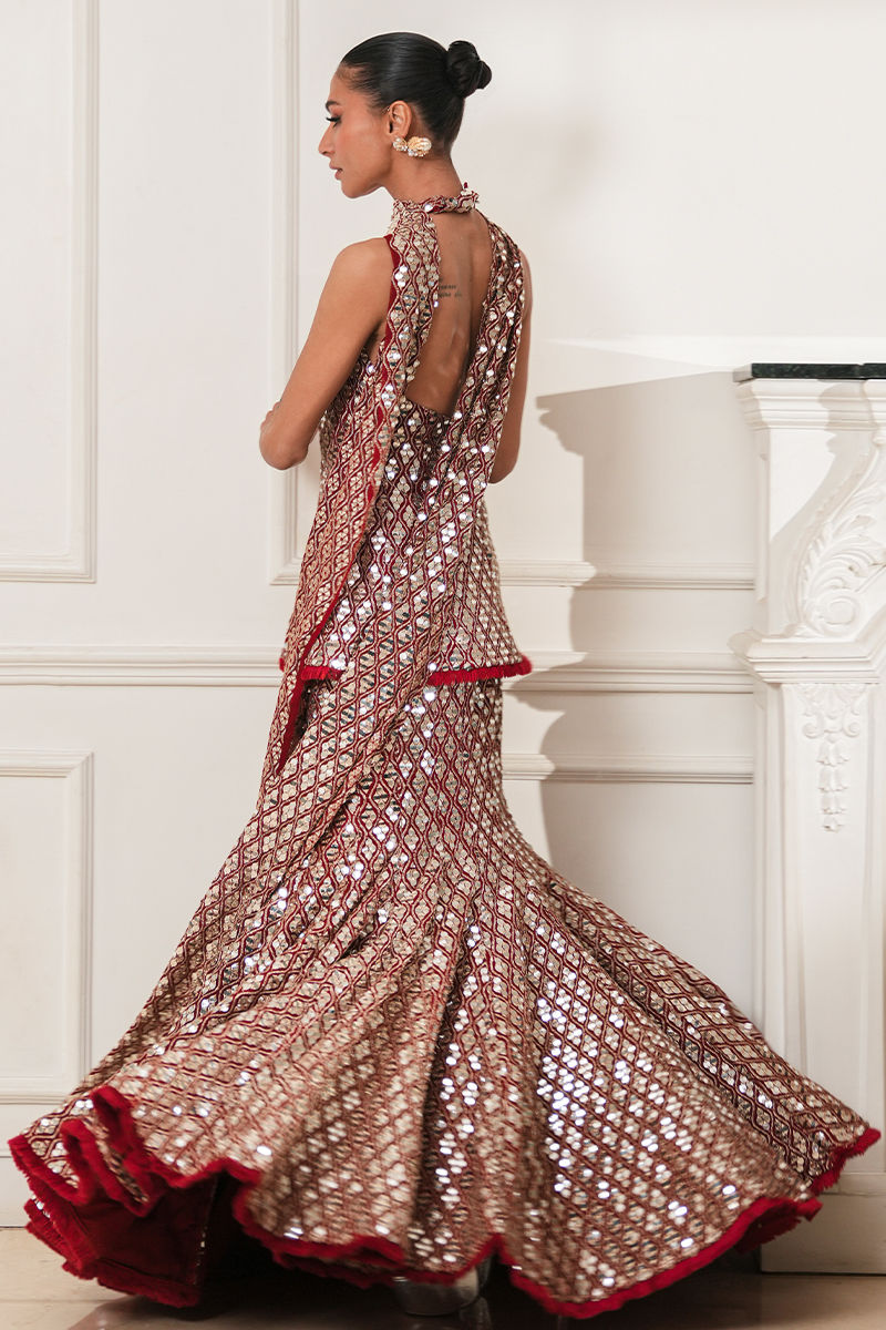 Red peplum paired with a mermaid lehenga, adorned with intricate foil and thread work throughout. Crafted in georgette chiffon, finished with delicate handmade threadwork edgings on the peplum and lehenga.