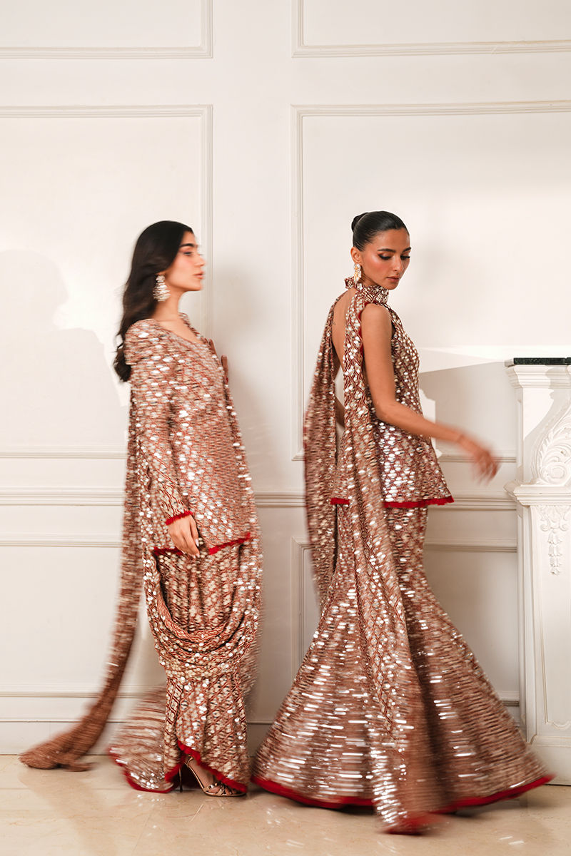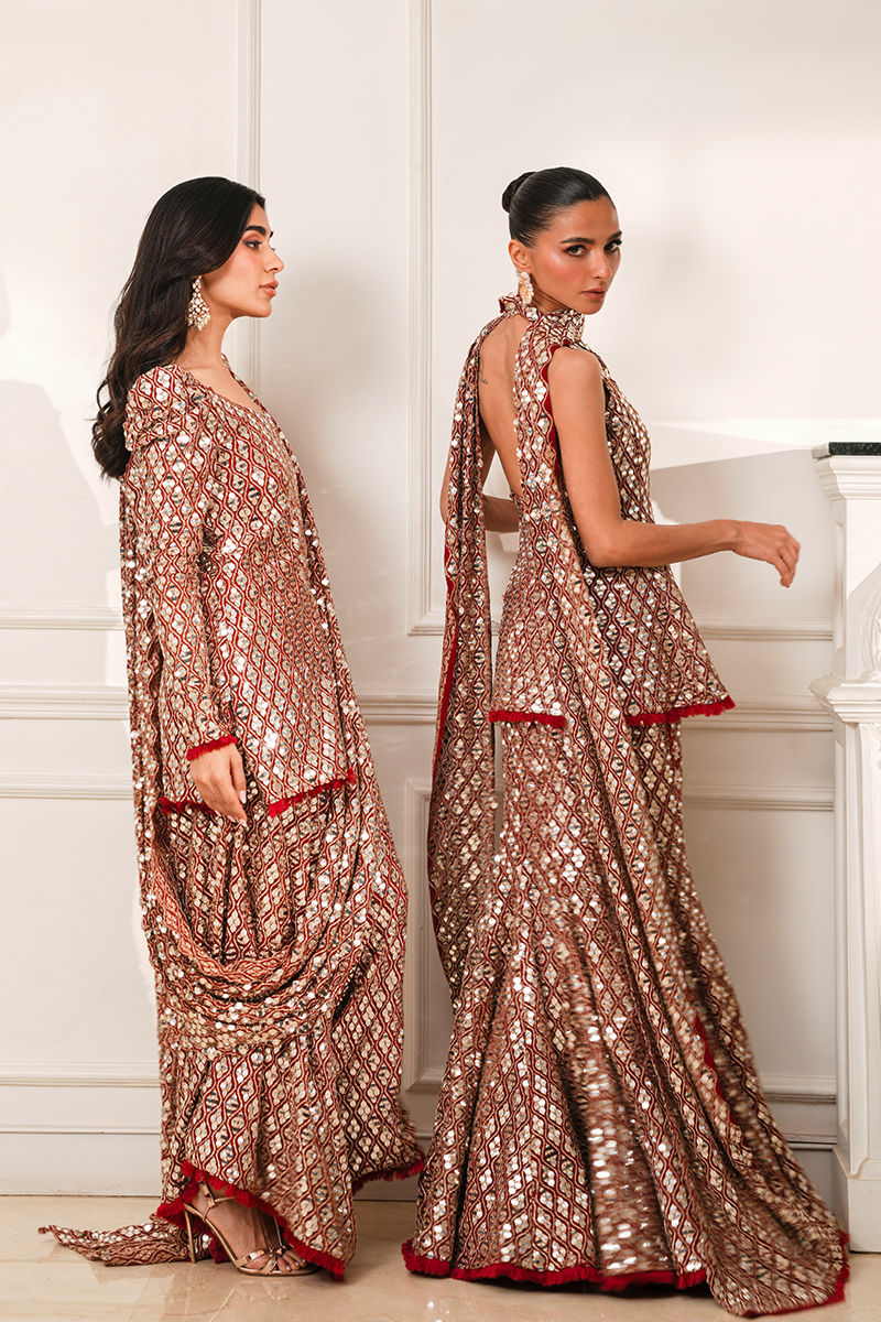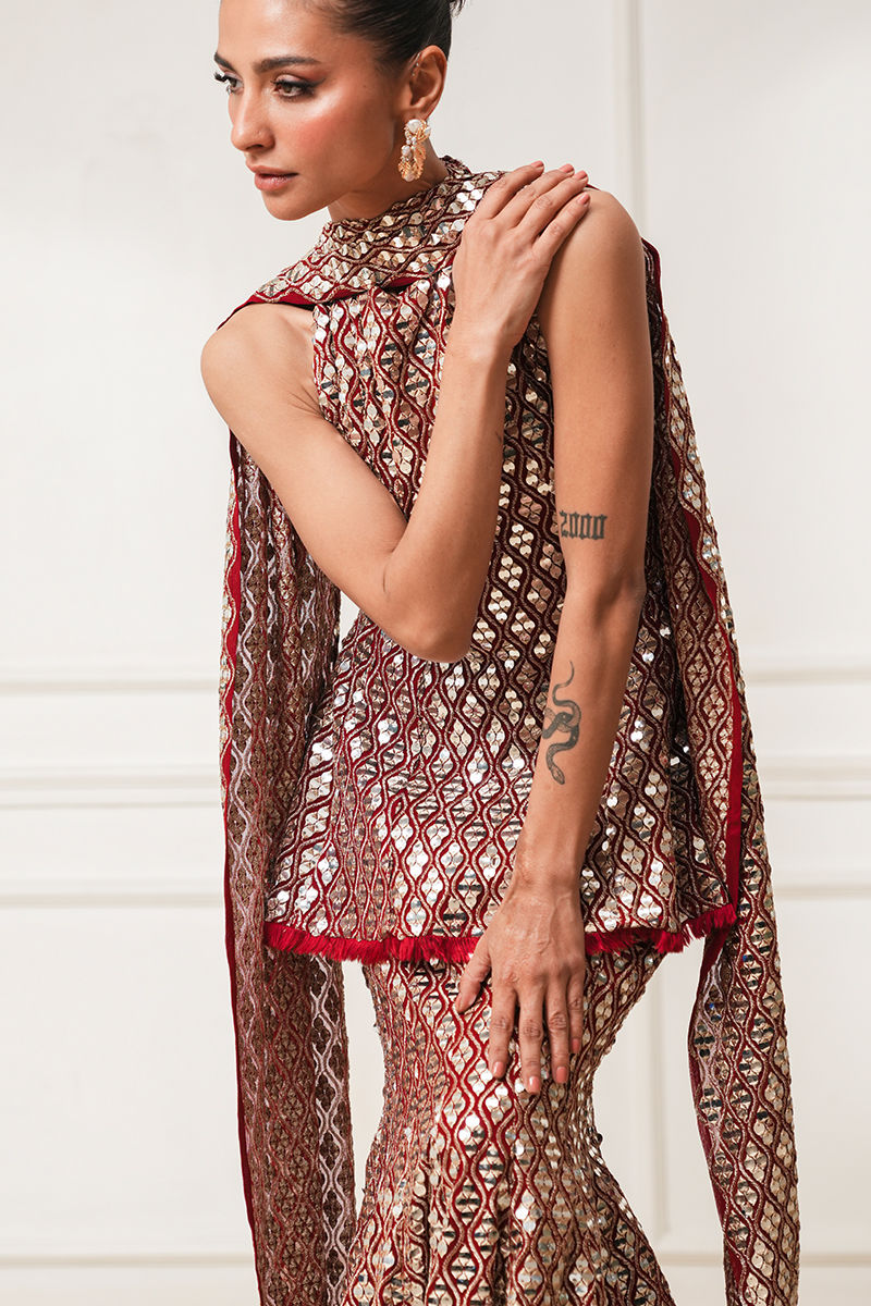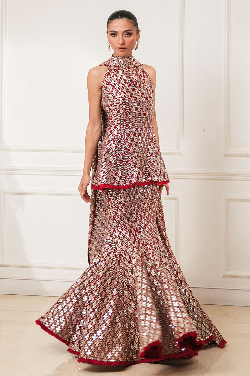 Red peplum paired with a mermaid lehenga, adorned with intricate foil and thread work throughout. Crafted in georgette chiffon, finished with delicate handmade threadwork edgings on the peplum and lehenga.