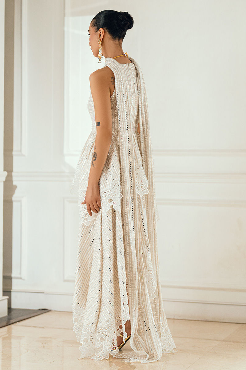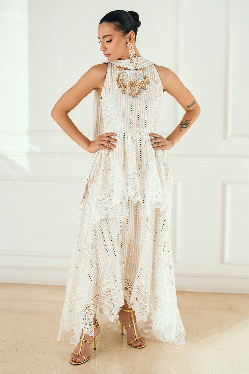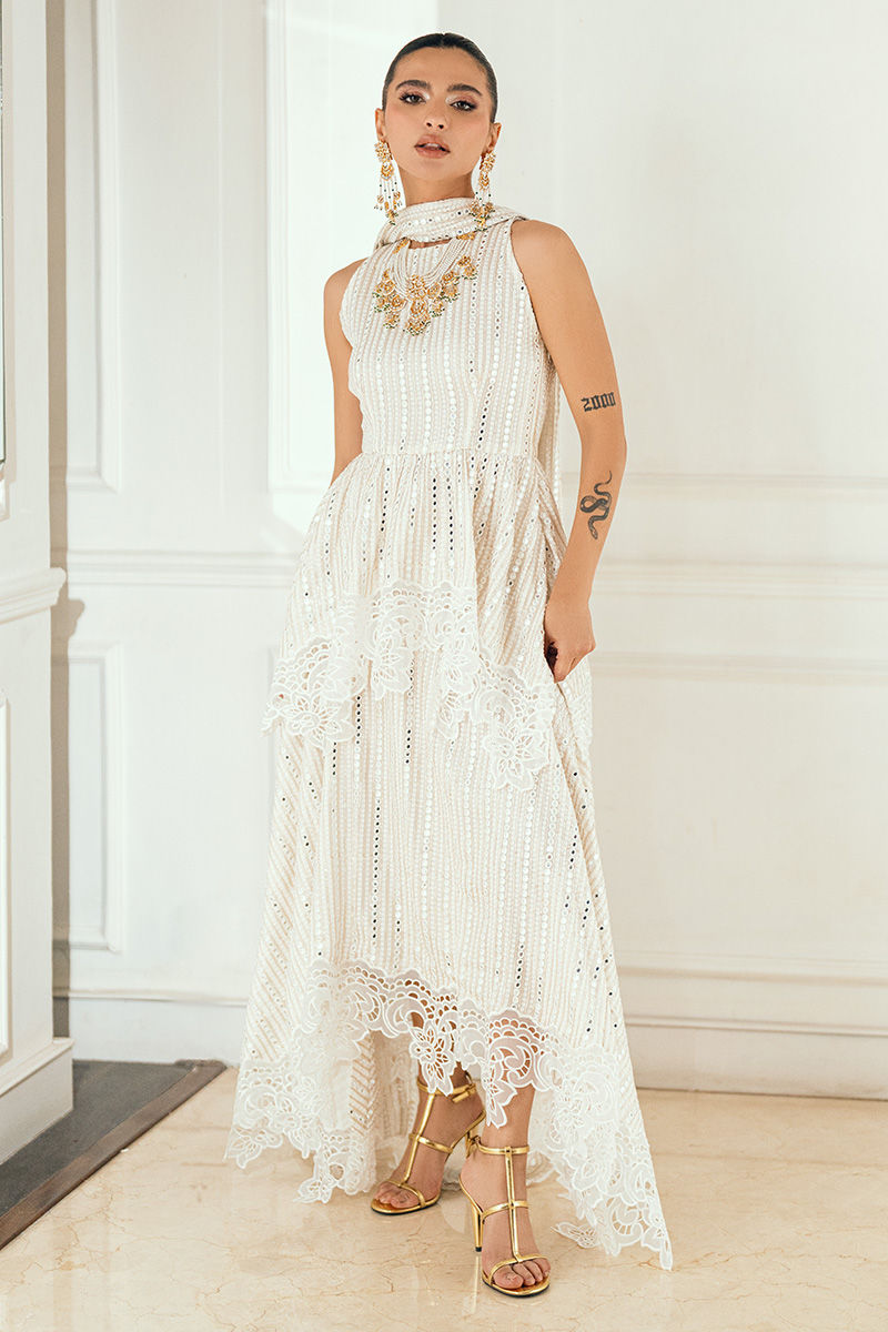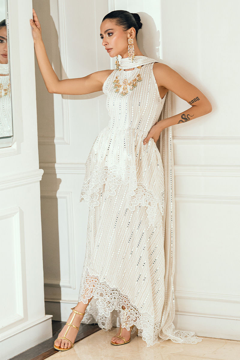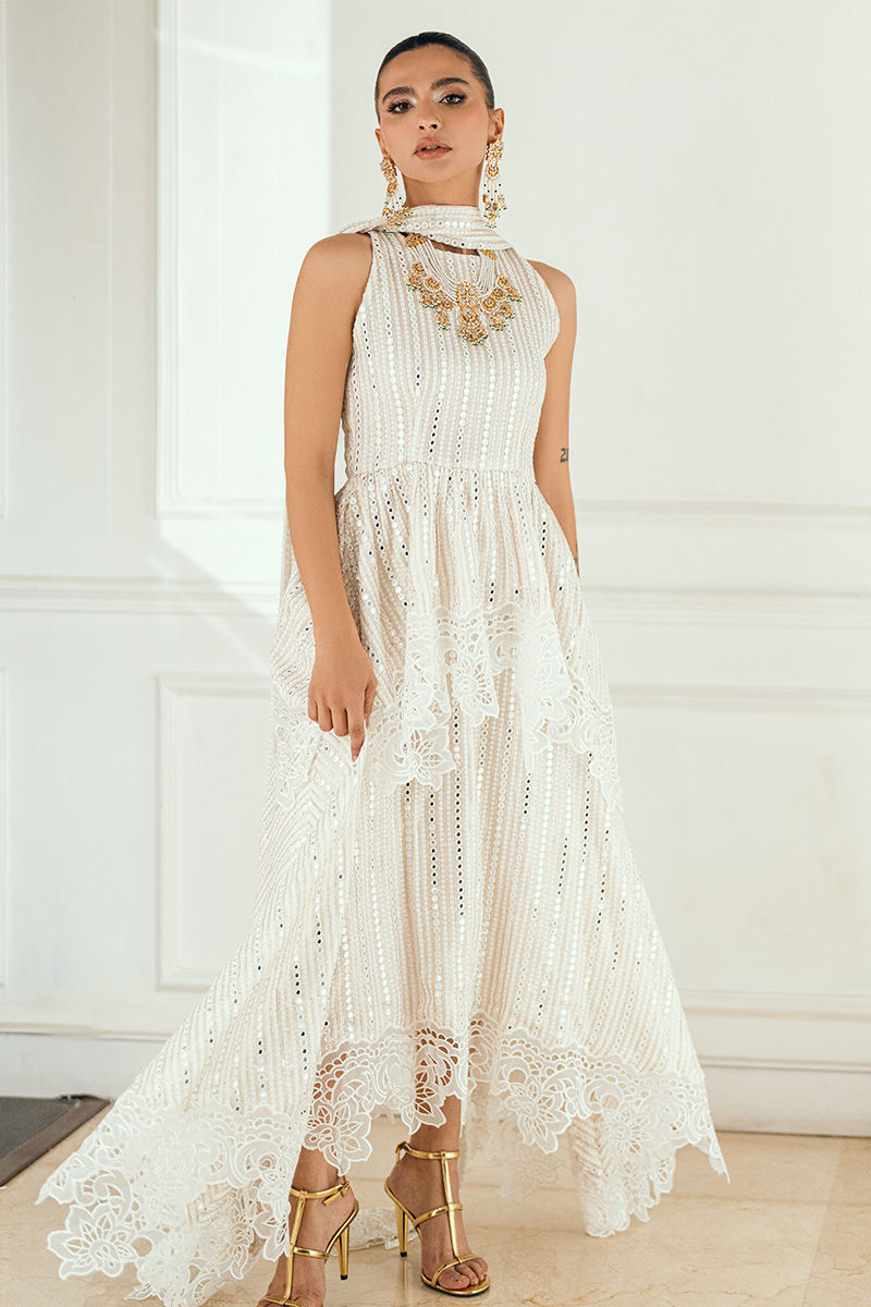 Saira is an elegant white chiffon shirt adorned with intricate thread and foil embroidery all over, complemented by floral cutwork appliqué and delicate threadwork borders. The look is paired with a layered lehnga and a pleated dupatta, bringing volume and grace to the ensemble.