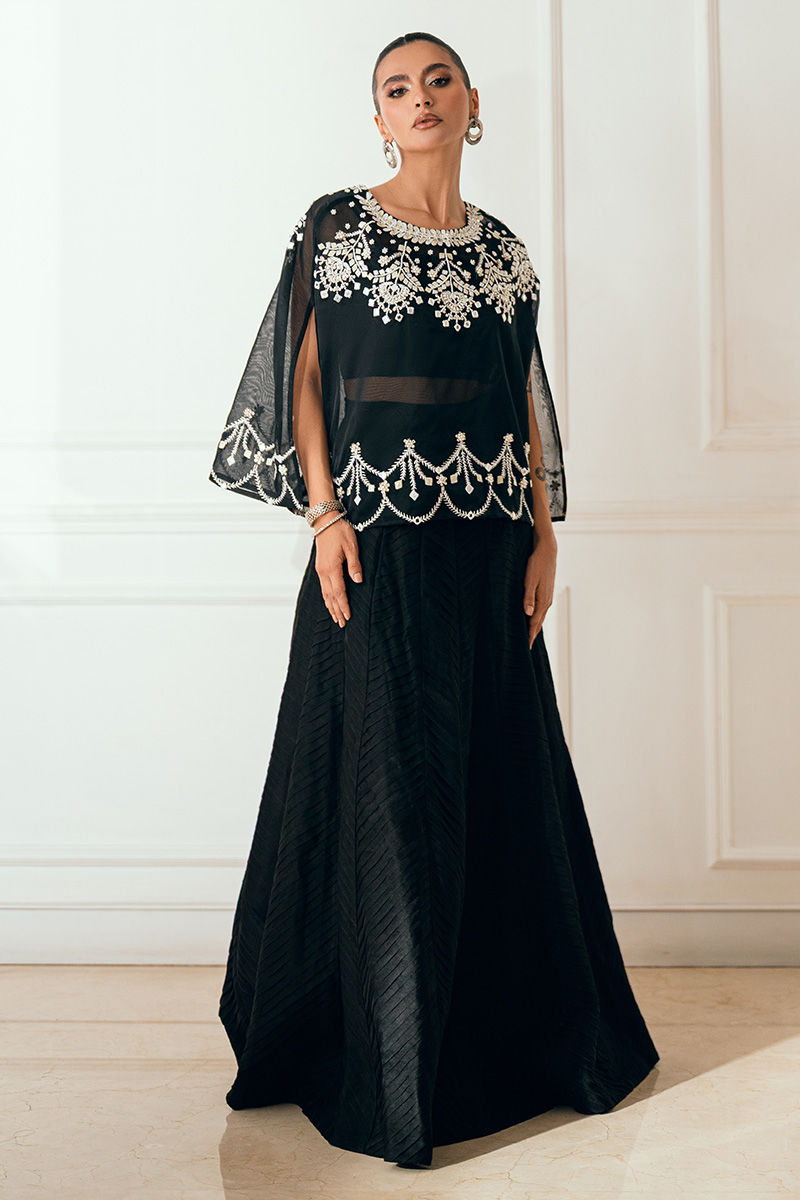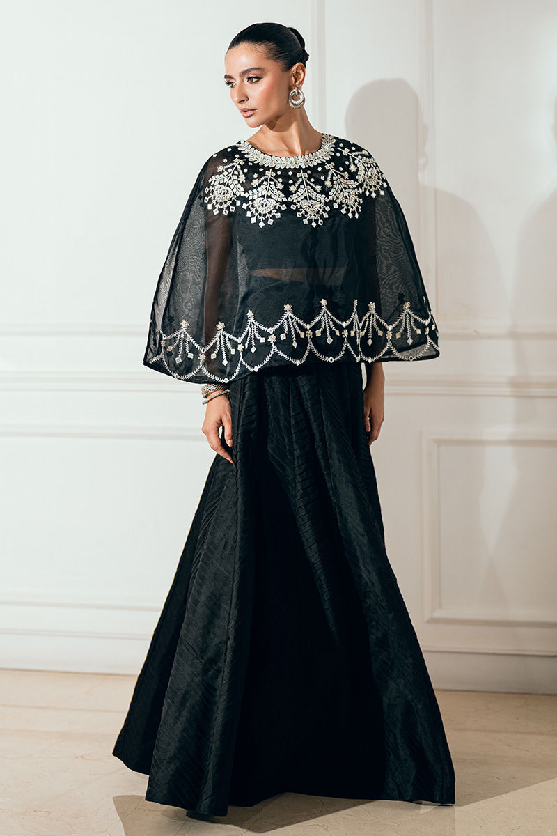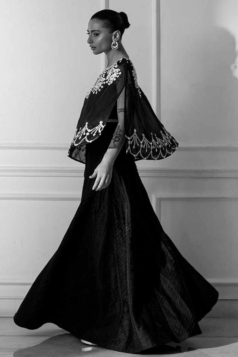 Soha is a stunning black organza poncho adorned with intricate handwork featuring beads, thread embroidery, and delicate foil accents. The poncho is paired with a pleated organza choli and a pure organza pleated lehnga, handmade with kankan for graceful volume and flow.