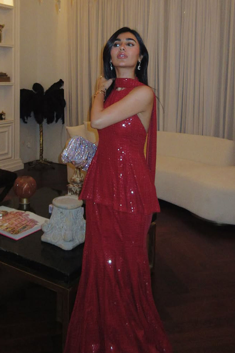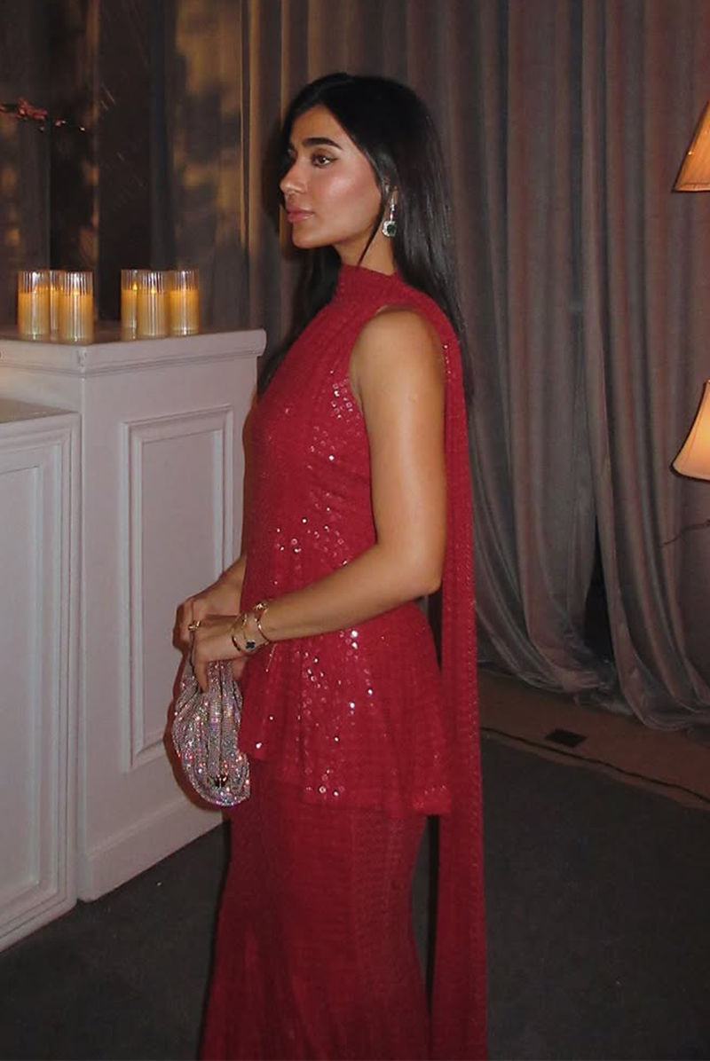 Yasmine is a radiant red sequins-work peplum halter shirt paired with a mermaid-style lehnga, designed to make a captivating statement. The halter shirt shimmers with delicate sequin embellishment, while the lehnga is finished with a graceful kankan that adds volume and movement to the silhouette. Shirt length 26 inches. Lehnga length 43 inches. Front neckline 4.5 inches. Back neckline 13 inches.
