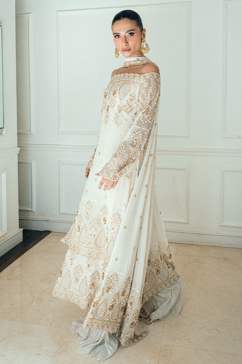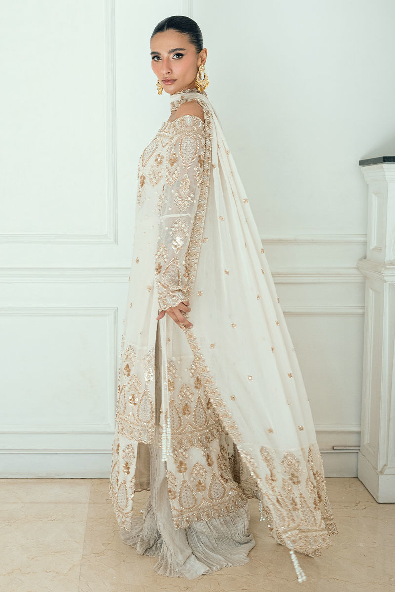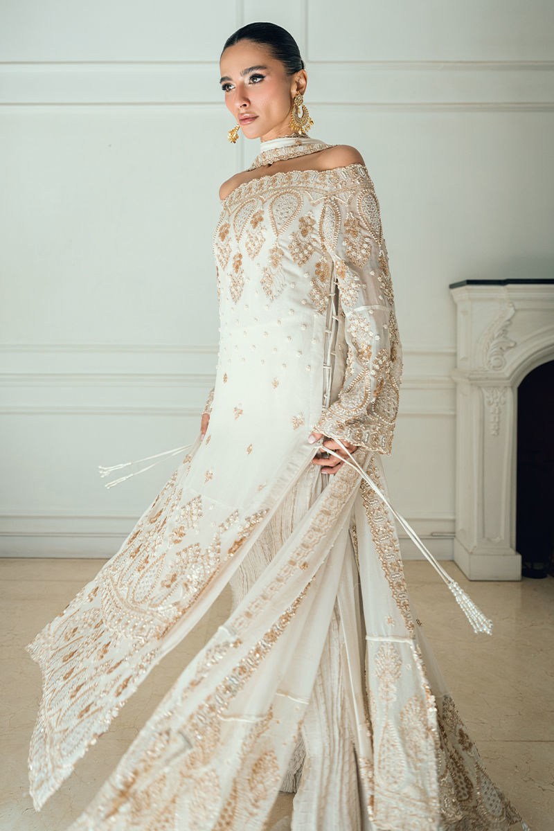 Zunaira ivory georgette chiffon shirt carries delicate thread, pearl, and bead borders throughout. Designed as a double-panel silhouette finished with pearl tassels along the sides.